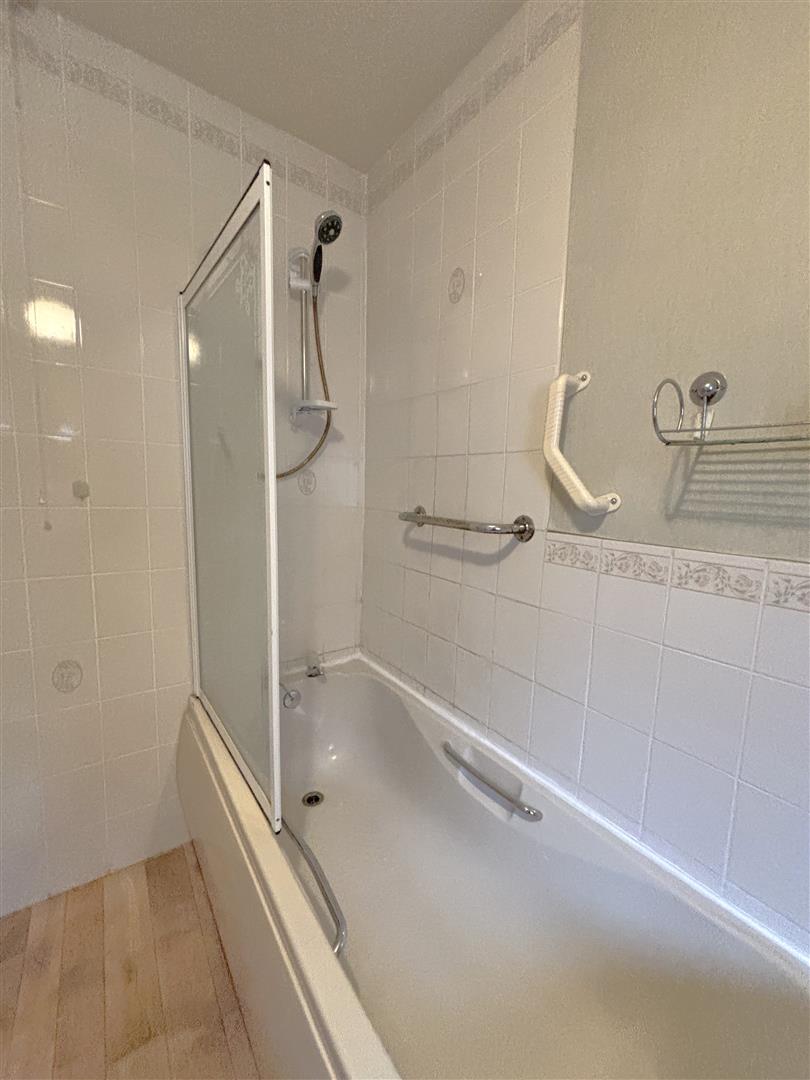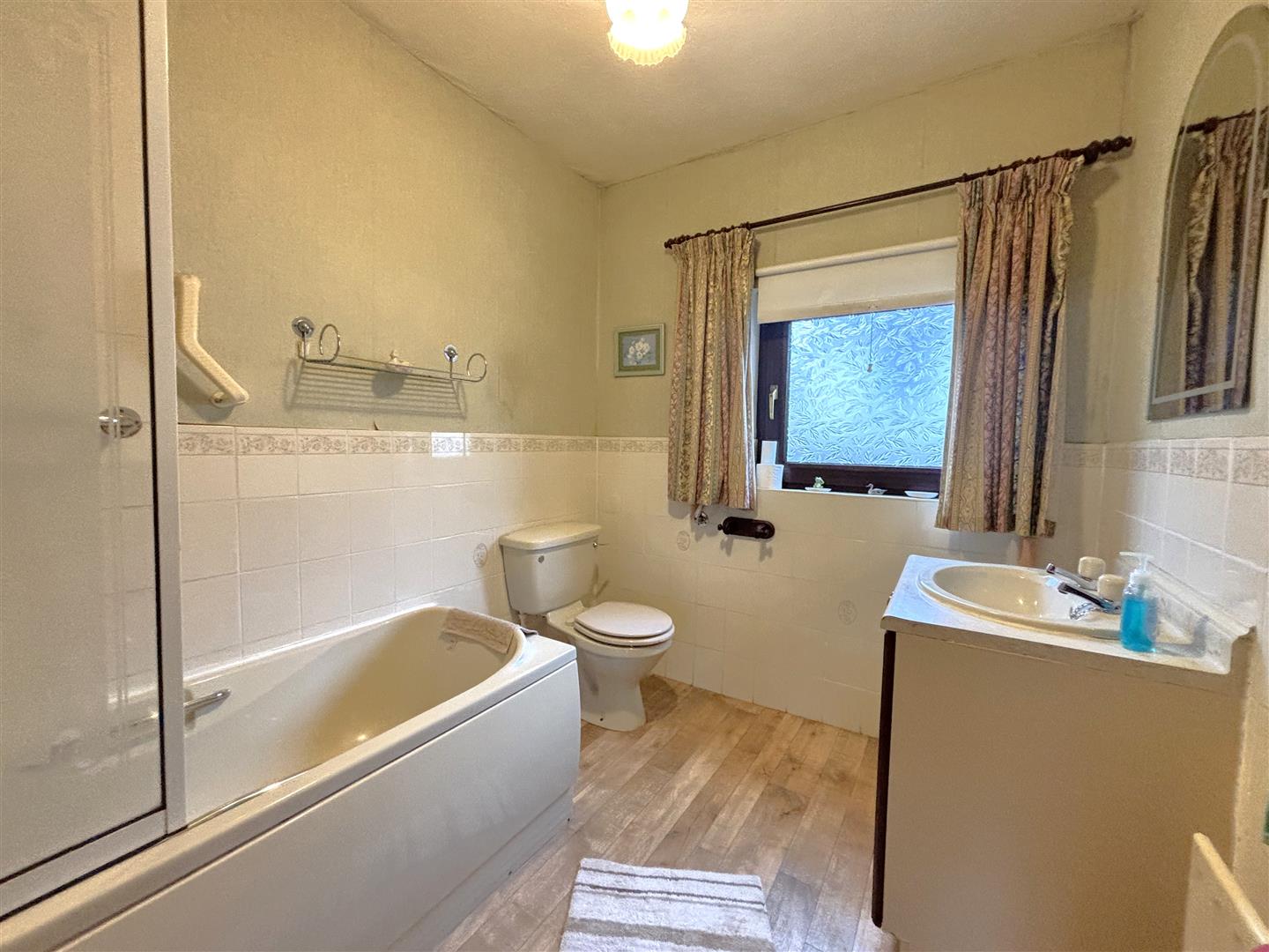 Classic white bathroom suite comprising panelled bath, electric shower, vanity unit, low flush wc, featured radiator, partly tiled walls.