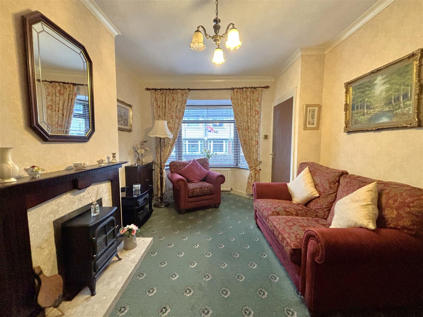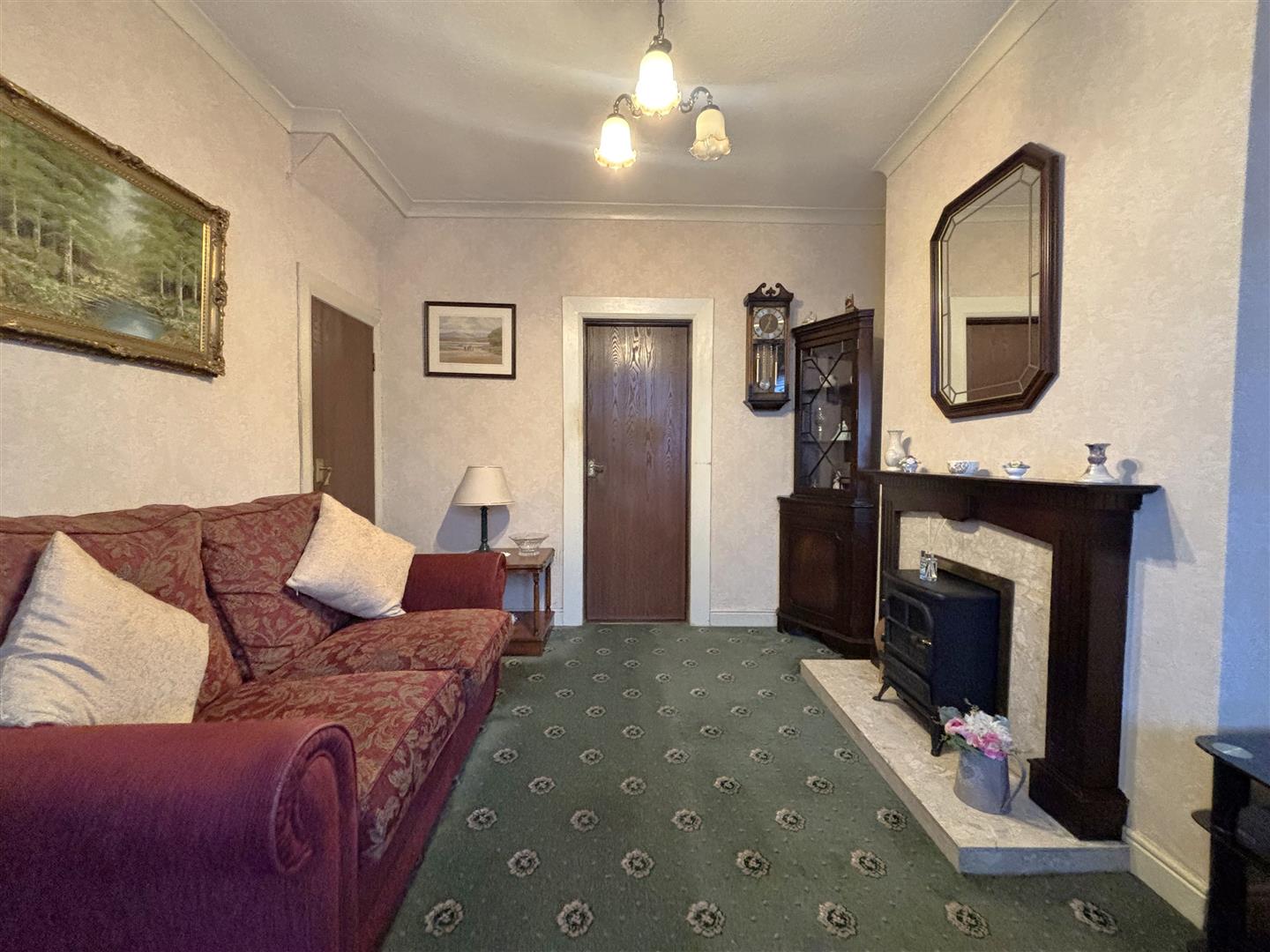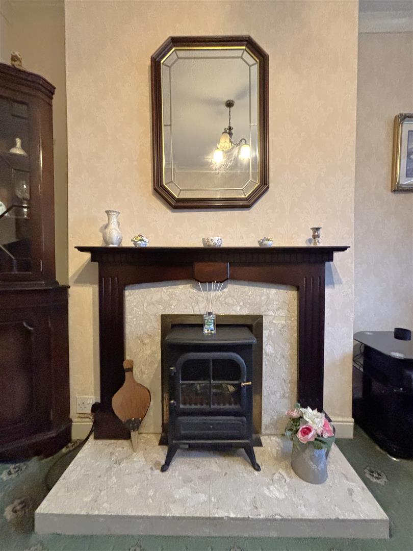 Classic fireplace with tiled inset and wooden hearth, double panelled radiator, understairs storage.