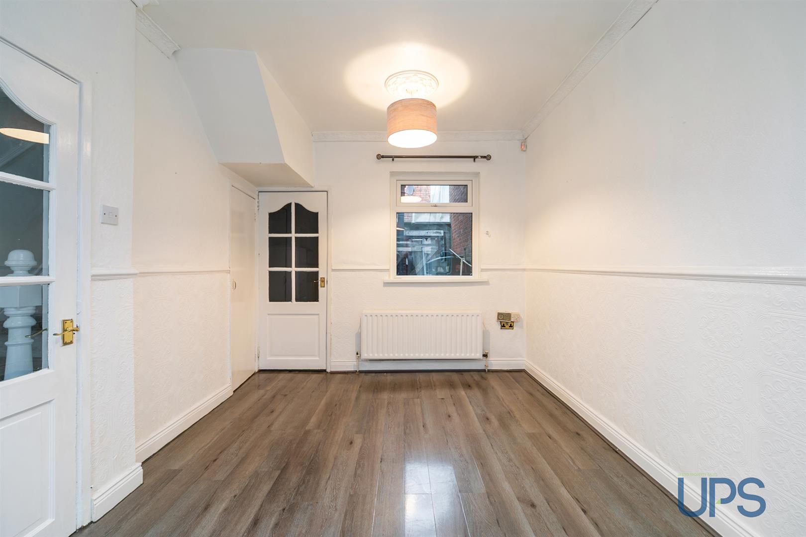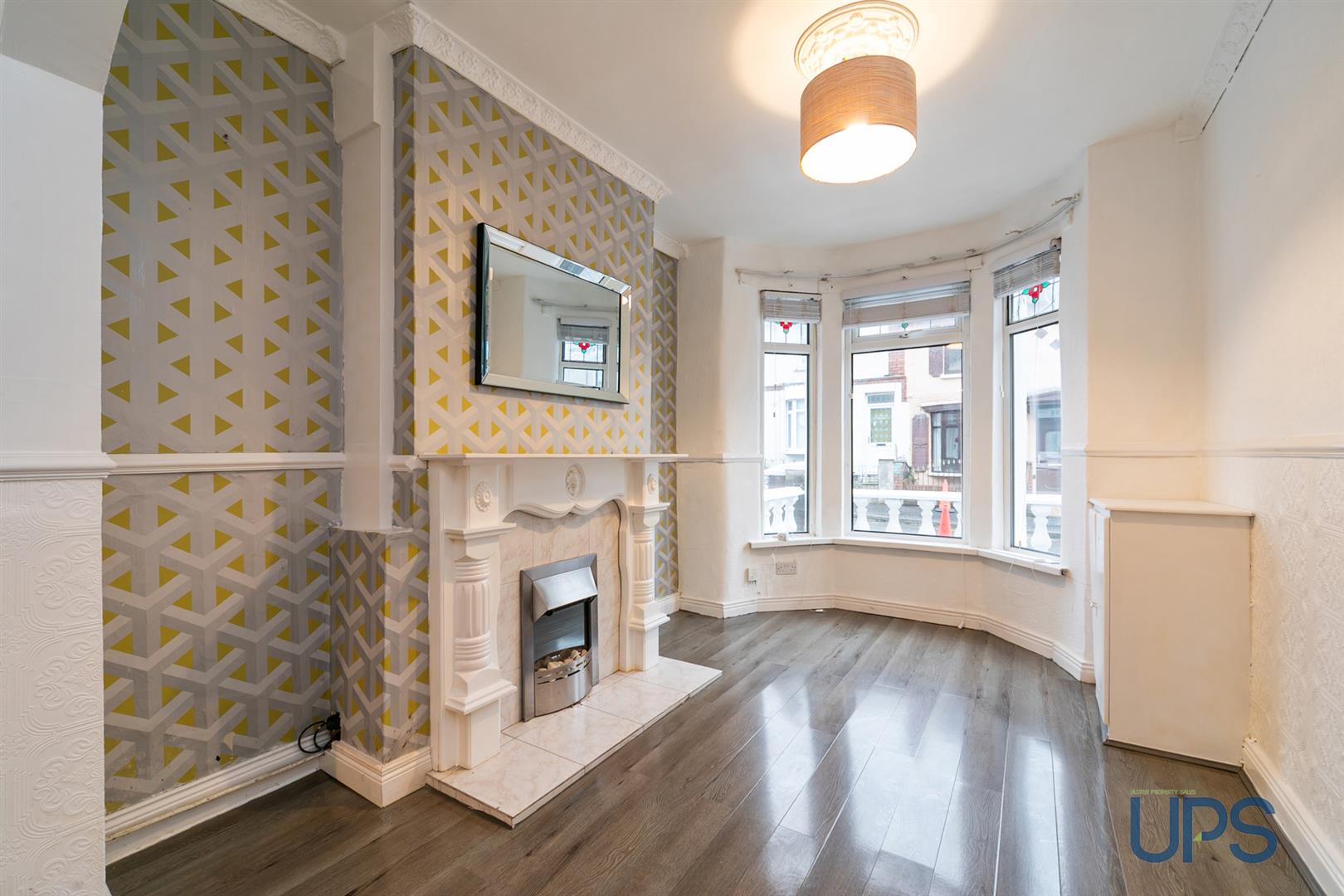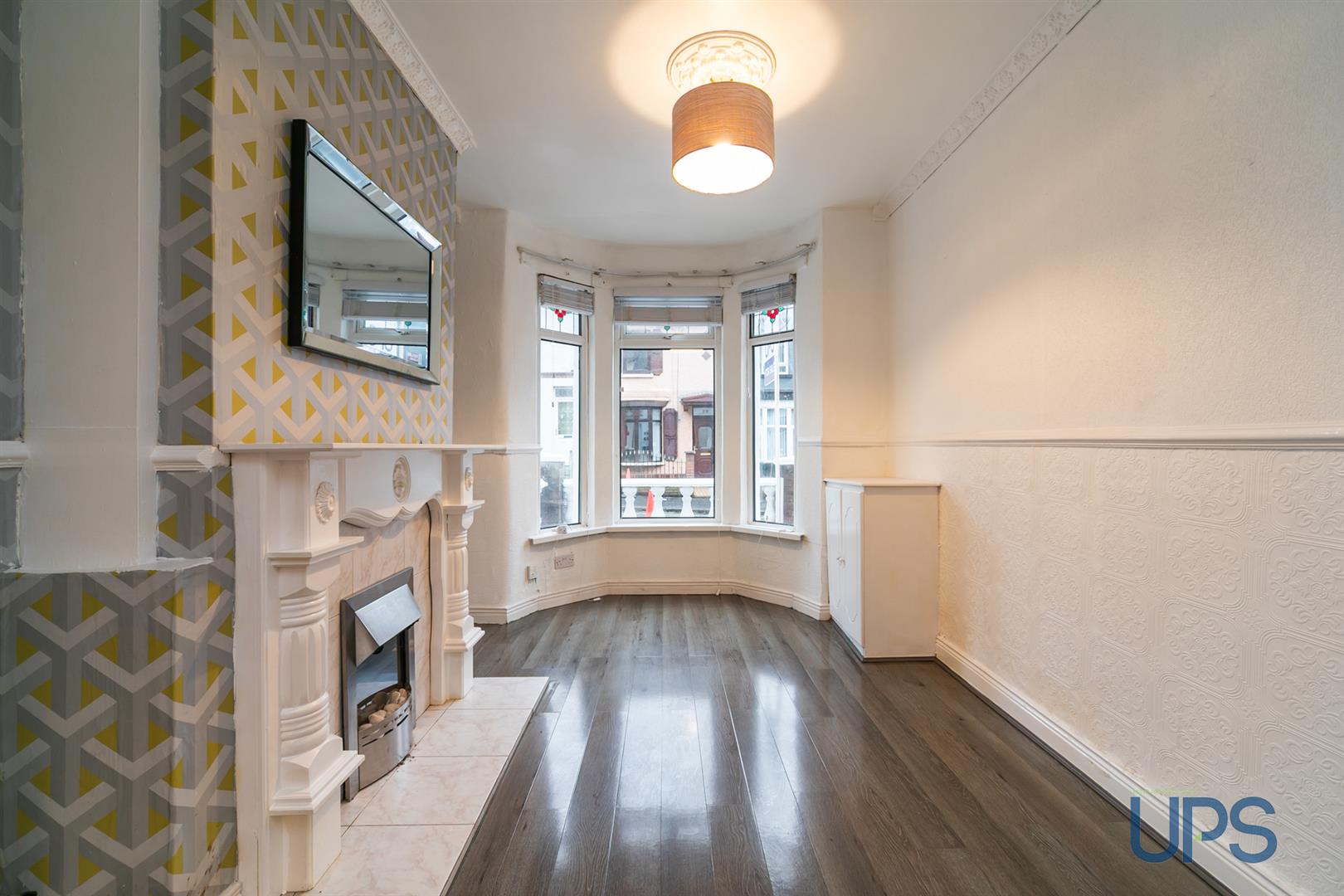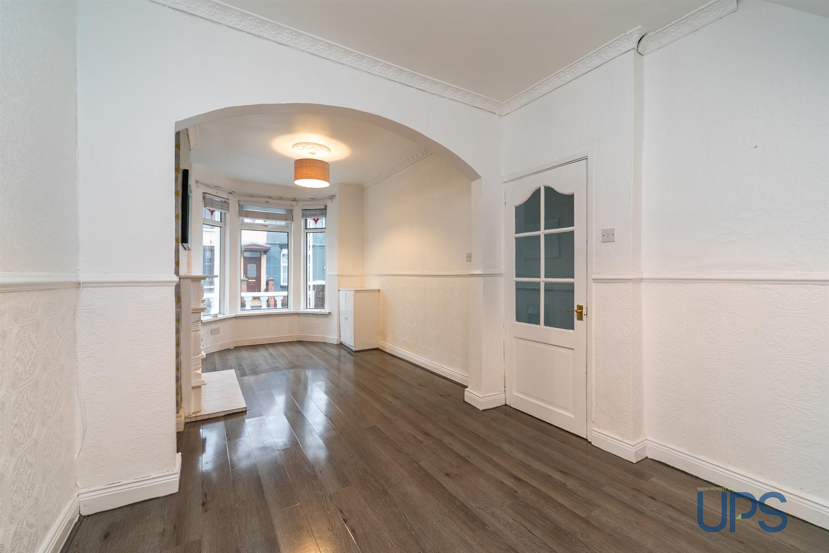 Bay window, wooden effect stripped floor, open plan to dining space.