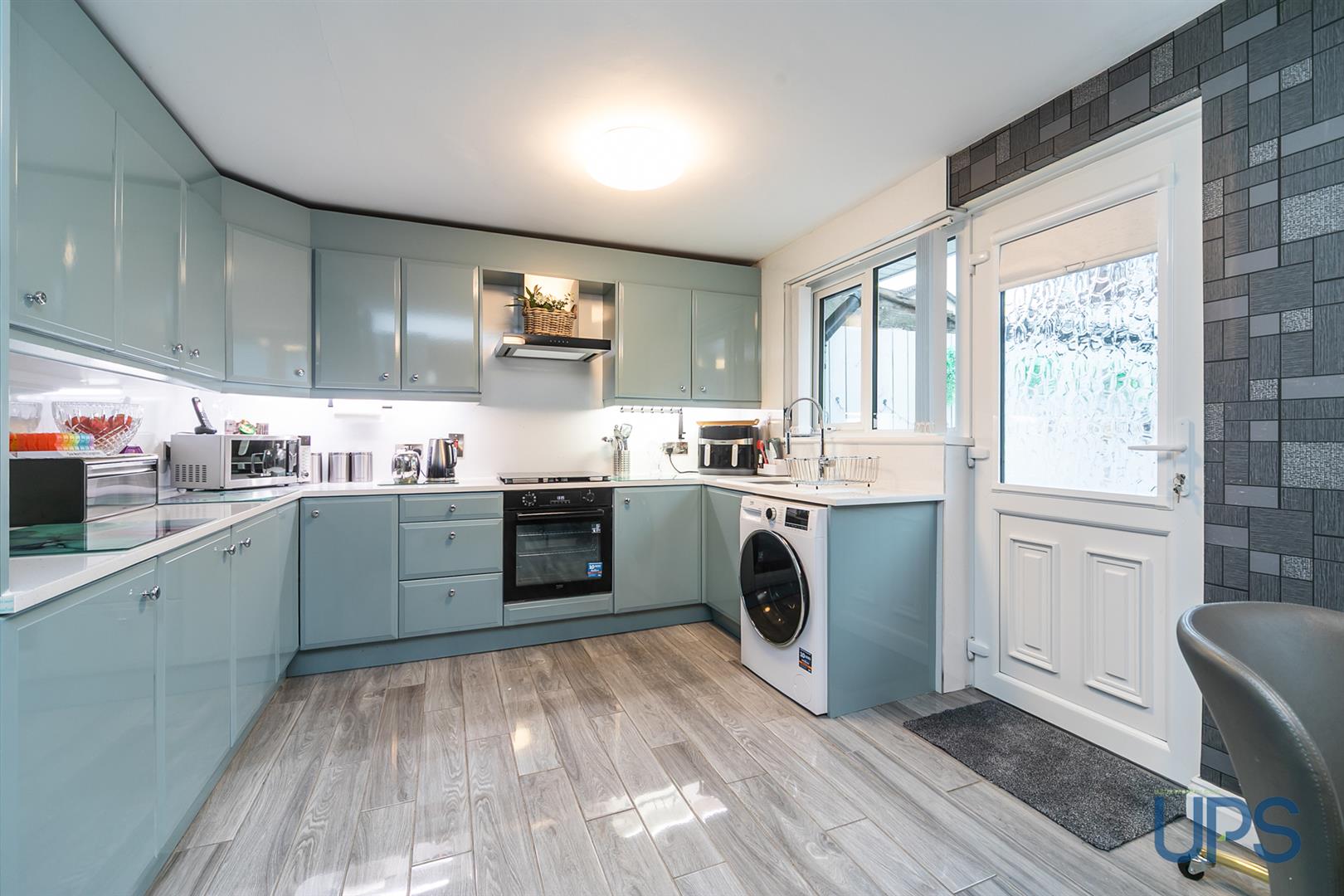 Range of high and low level units, single drainer sink unit, plumbed for washing machine, built-in hob and underoven, extractor fan, under unit lighting, plumbed for washing machine, open plan to dining space.