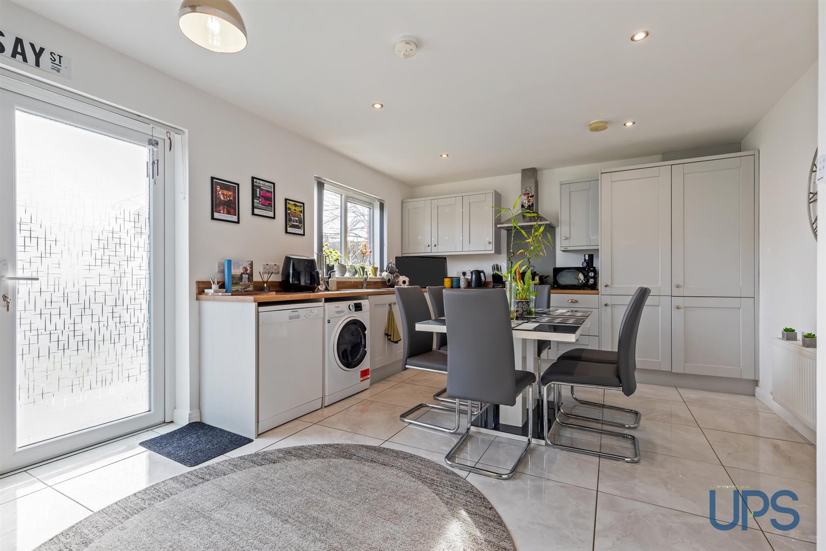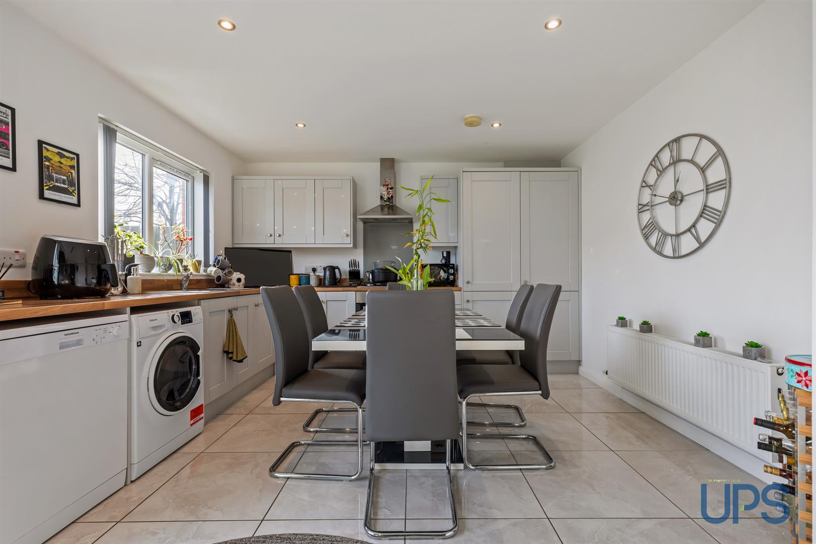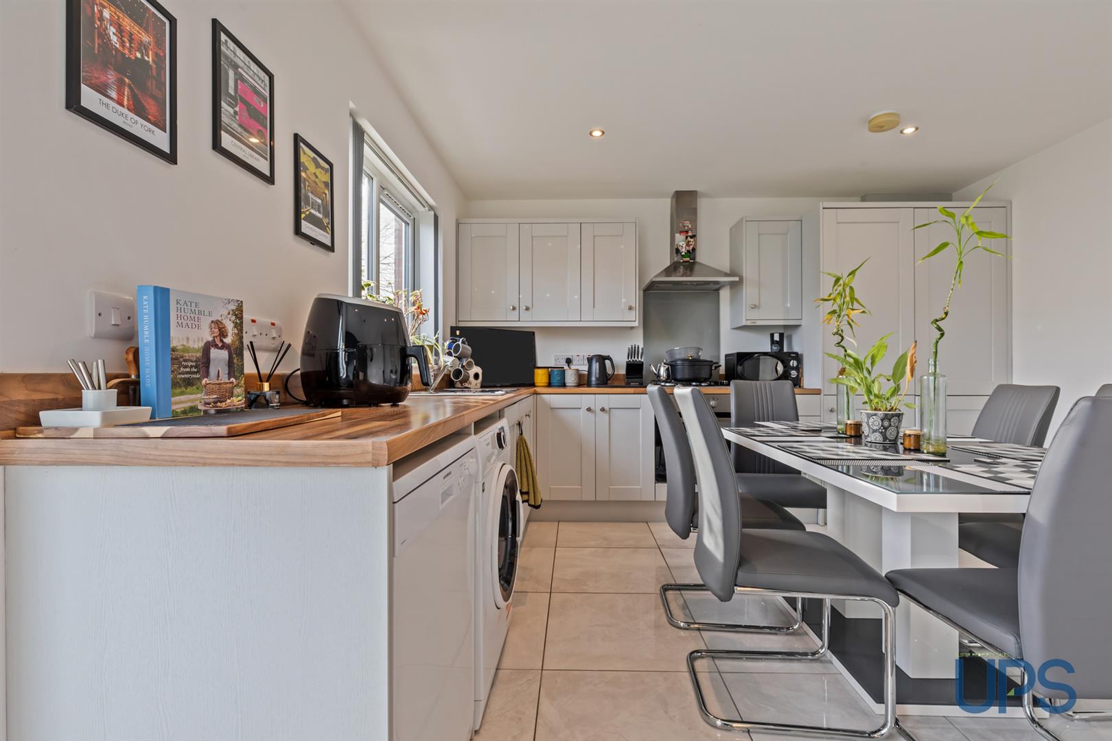 Single drainer stainless steel sink unit, range of high and low level units, wood effect formica worktops, built-in under oven and gas hob, stainless steel canopy extractor fan, glass splashback, integrated fridge/freezer, plumbed for washing machine, dishwasher space, double panelled radiator, porcelain tiled floor, recessed lighting, uPvc patio doors to rear.