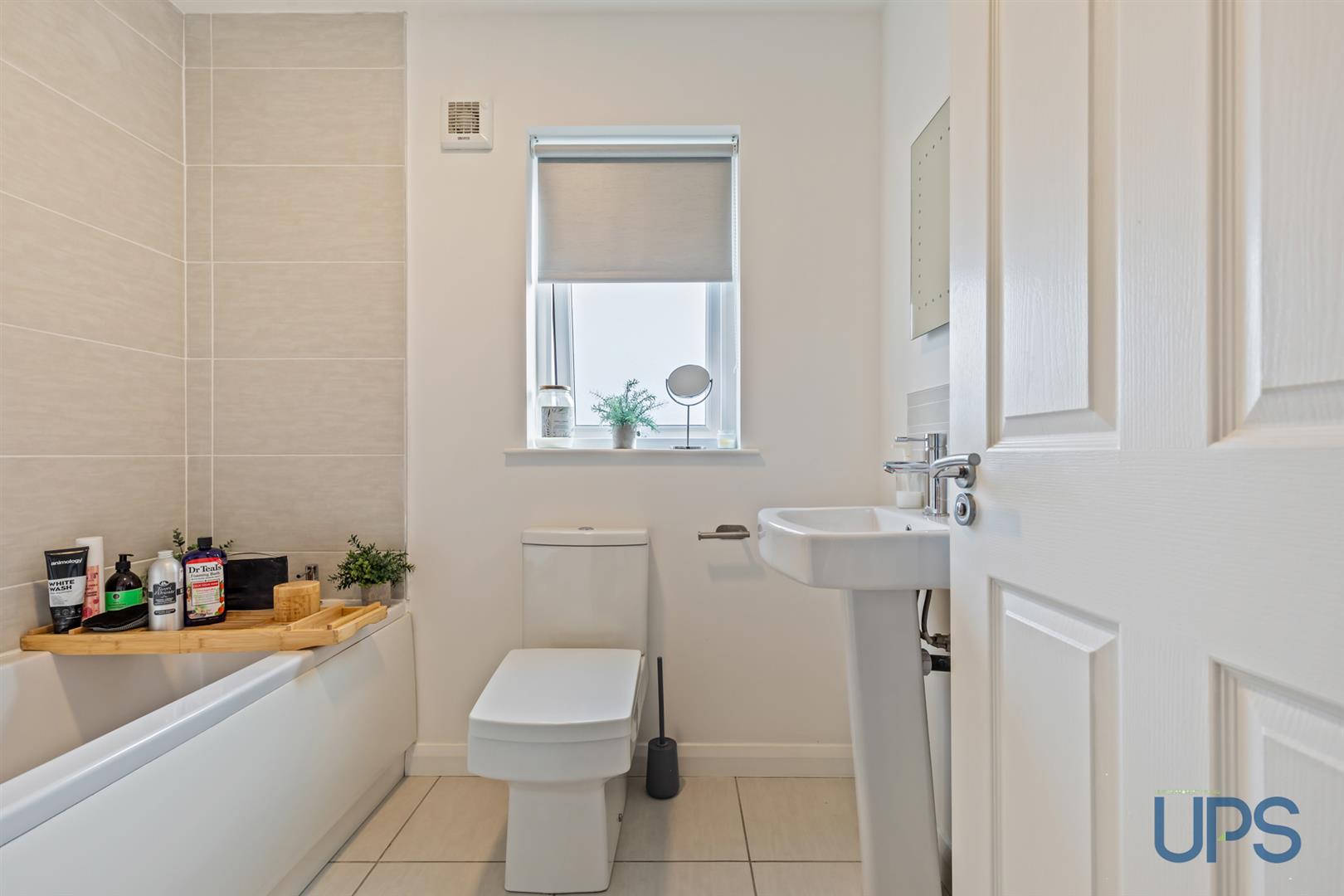 Modern white bathroom suite comprising panelled bath, pedestal wash hand basin, low flush wc, panelled radiator, ceramic tiled floor, partly tiled walls, extractor fan.
