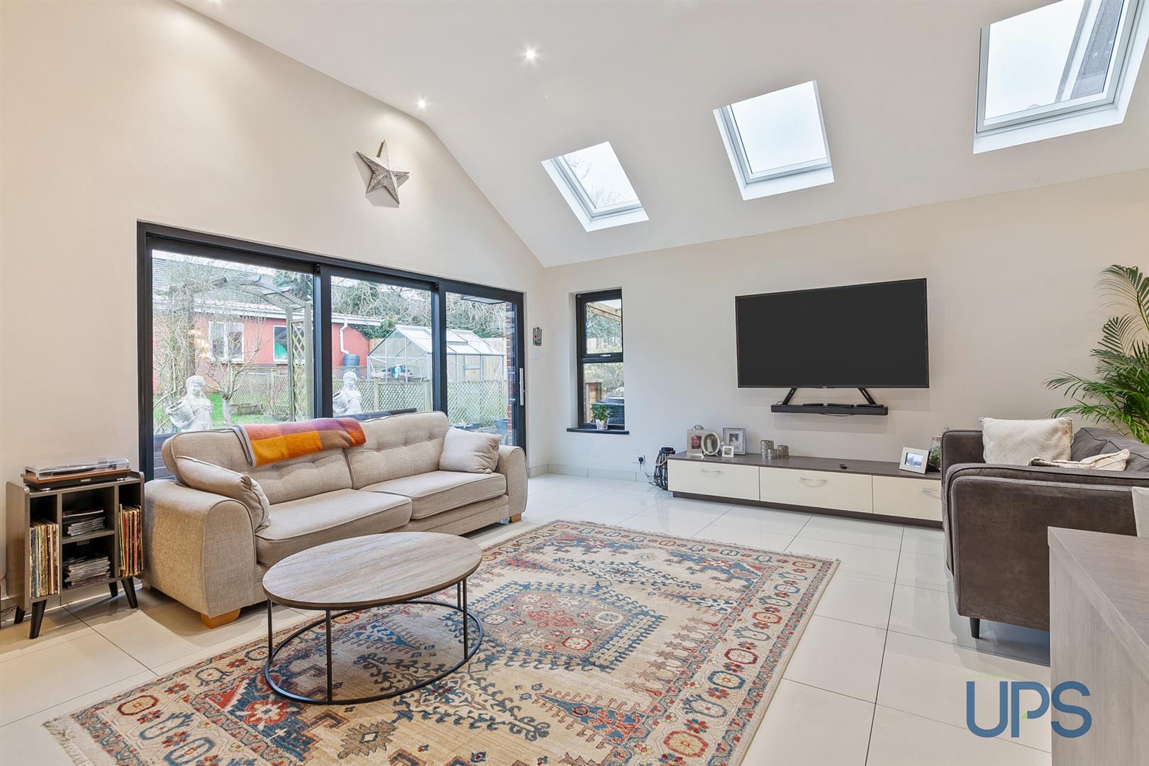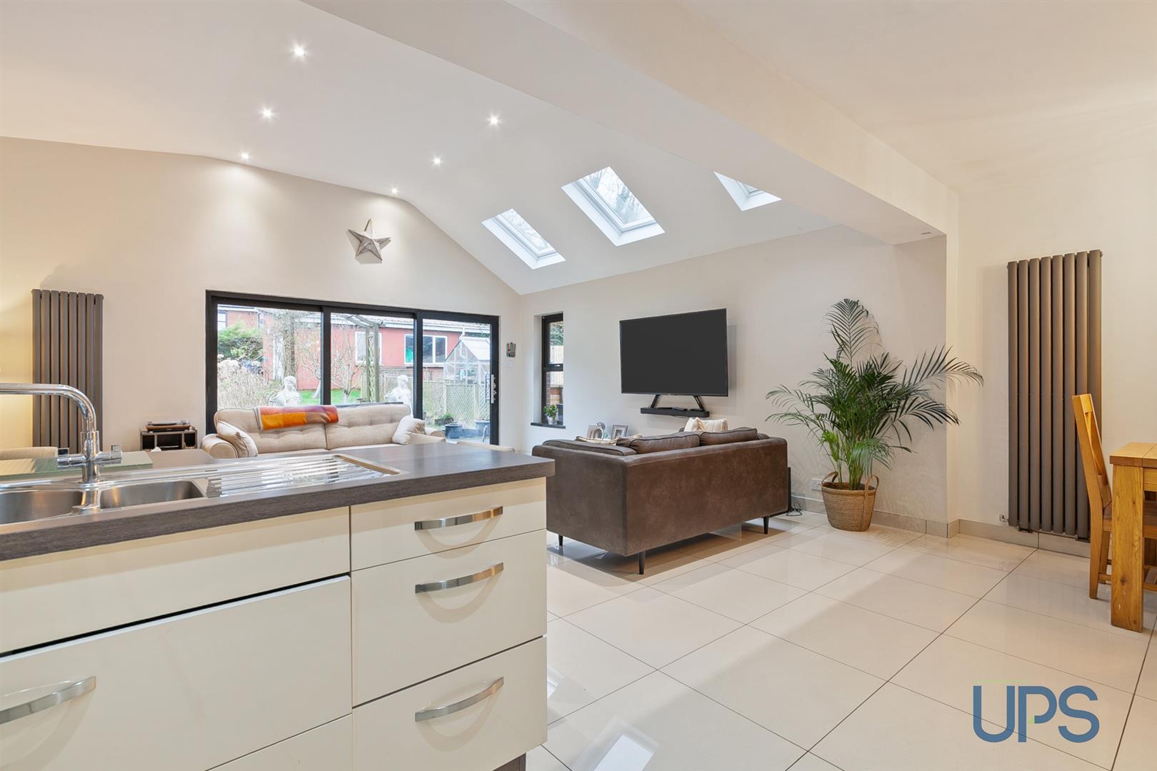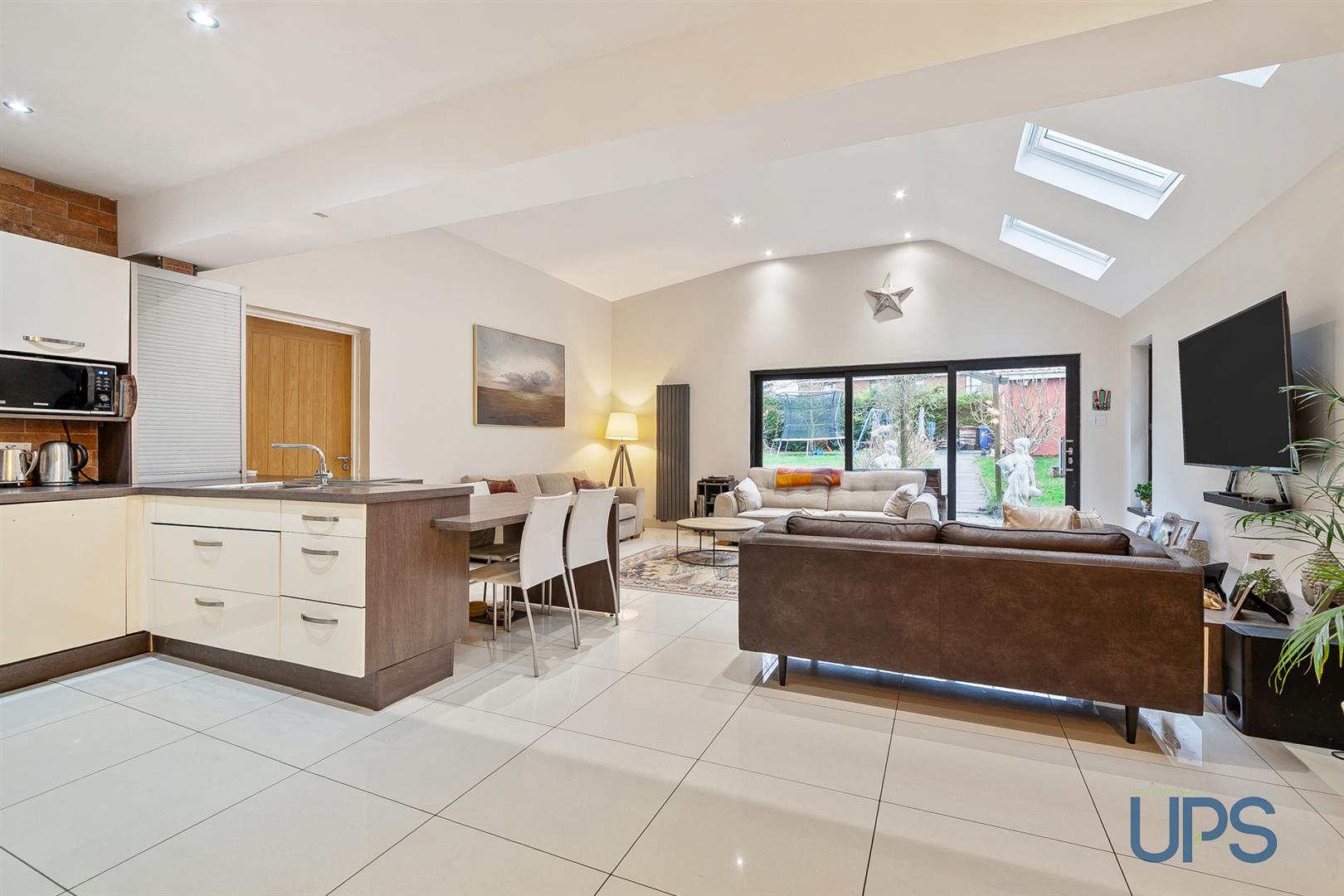 Range of high- and low-level units, single drainer stainless steel 1½ bowl sink unit, built-in oven, breakfast bar, spotlights, vertical radiator and beautiful tiled floor. Open plan to a most eye-catching, largely extended living space with Velux windows, sliding patio doors leading to extensive gardens enjoying a bright southerly aspect.