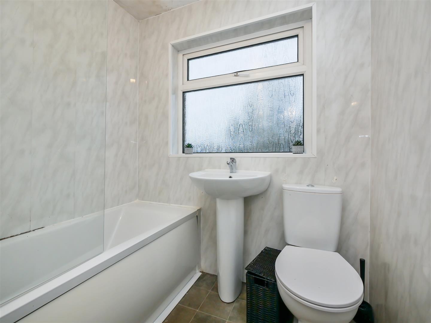 White suite comprising panelled bath, Mira shower, low flush w./c, pedestal wash hand basin, pvc panelled walls.