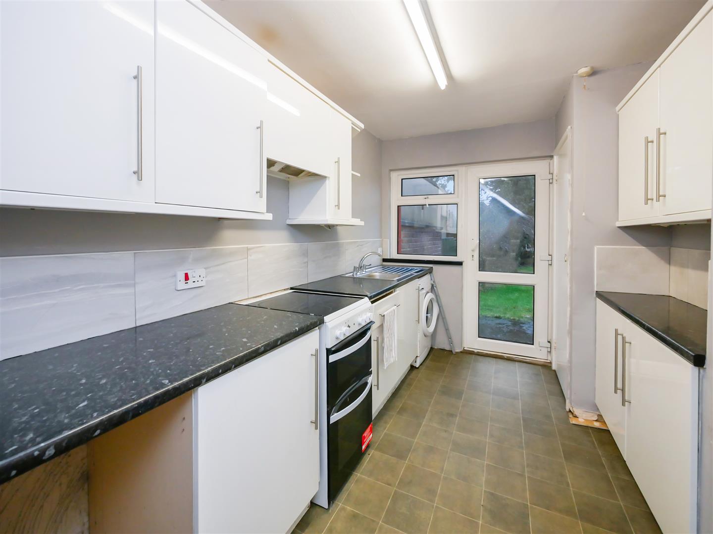 Range of high and low level units, single drainer sink unit with mixer taps, formica work surfaces, part tiled walls, extractor fan, cooker space, plumbed for washing machine.