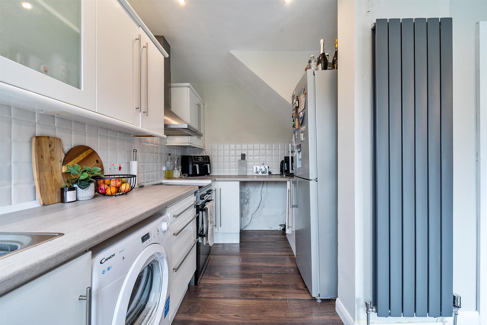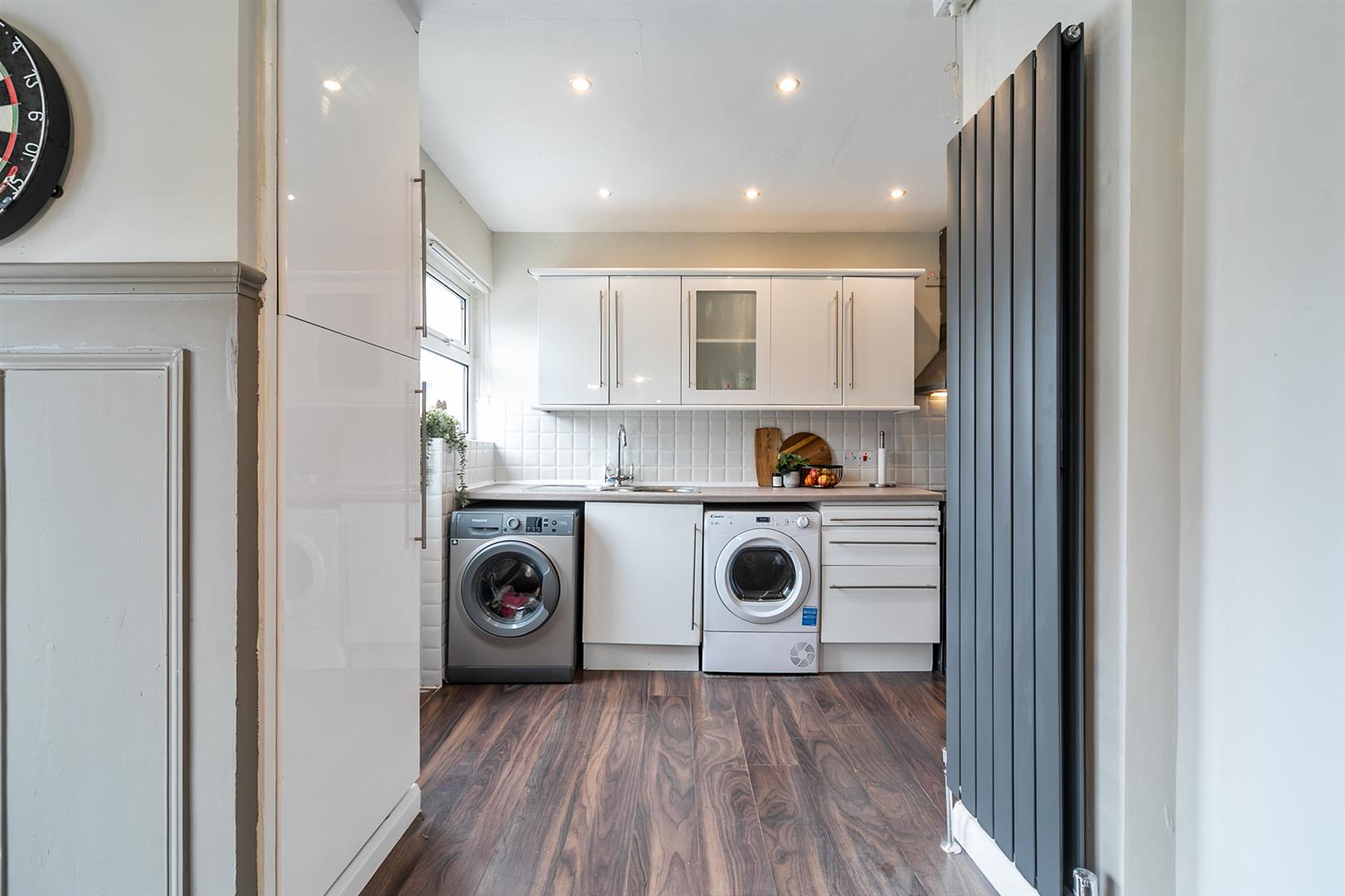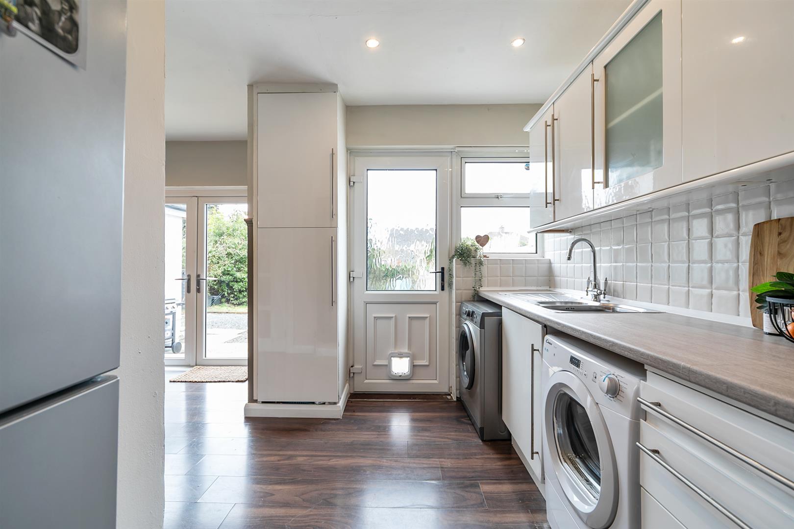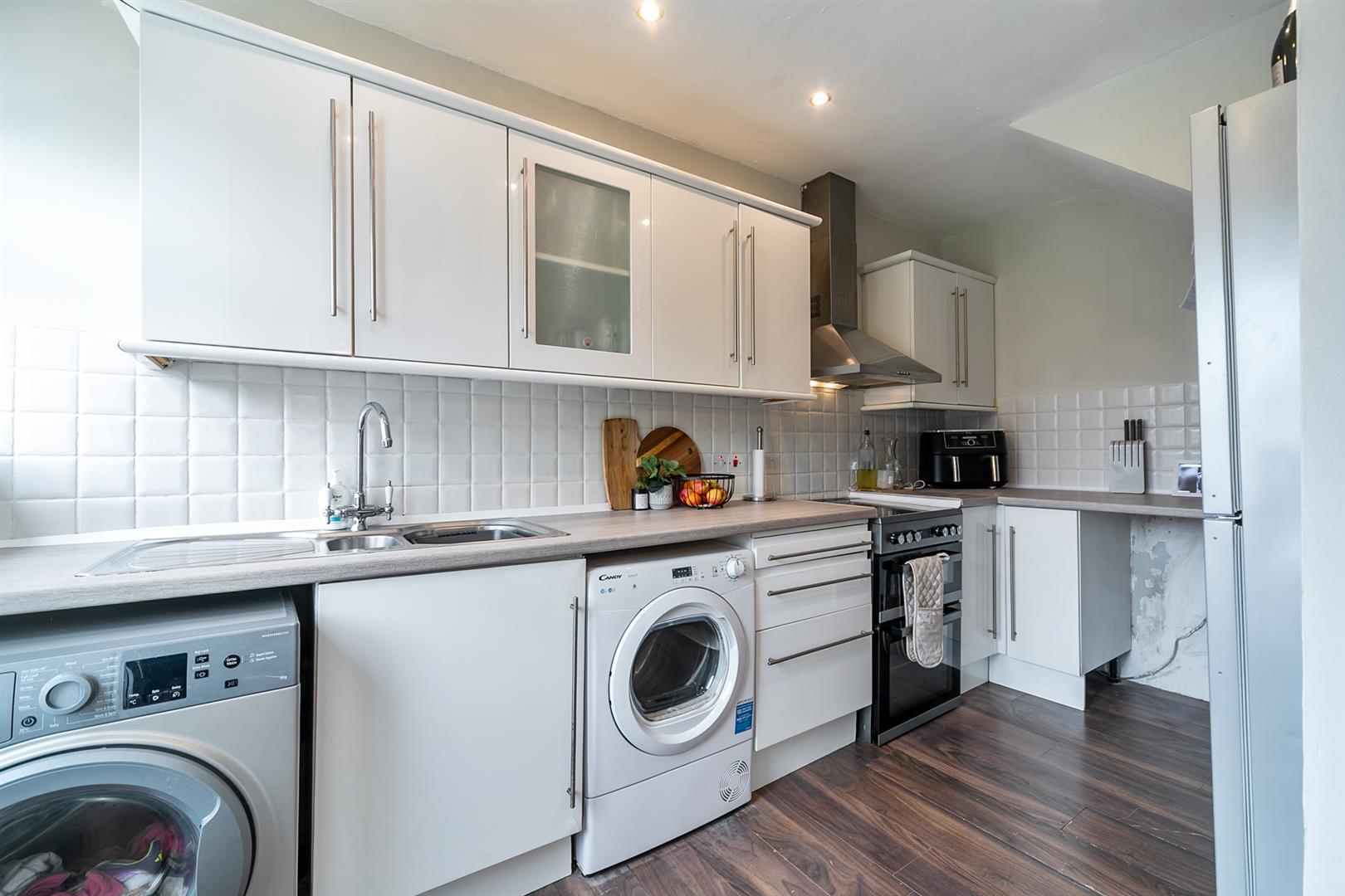 Full range of high and low level units, wood effect work tops, stainless overhead extractor fan, plumbed for washing machine, part tiled walls. Spot-lights. Laminate flooring.