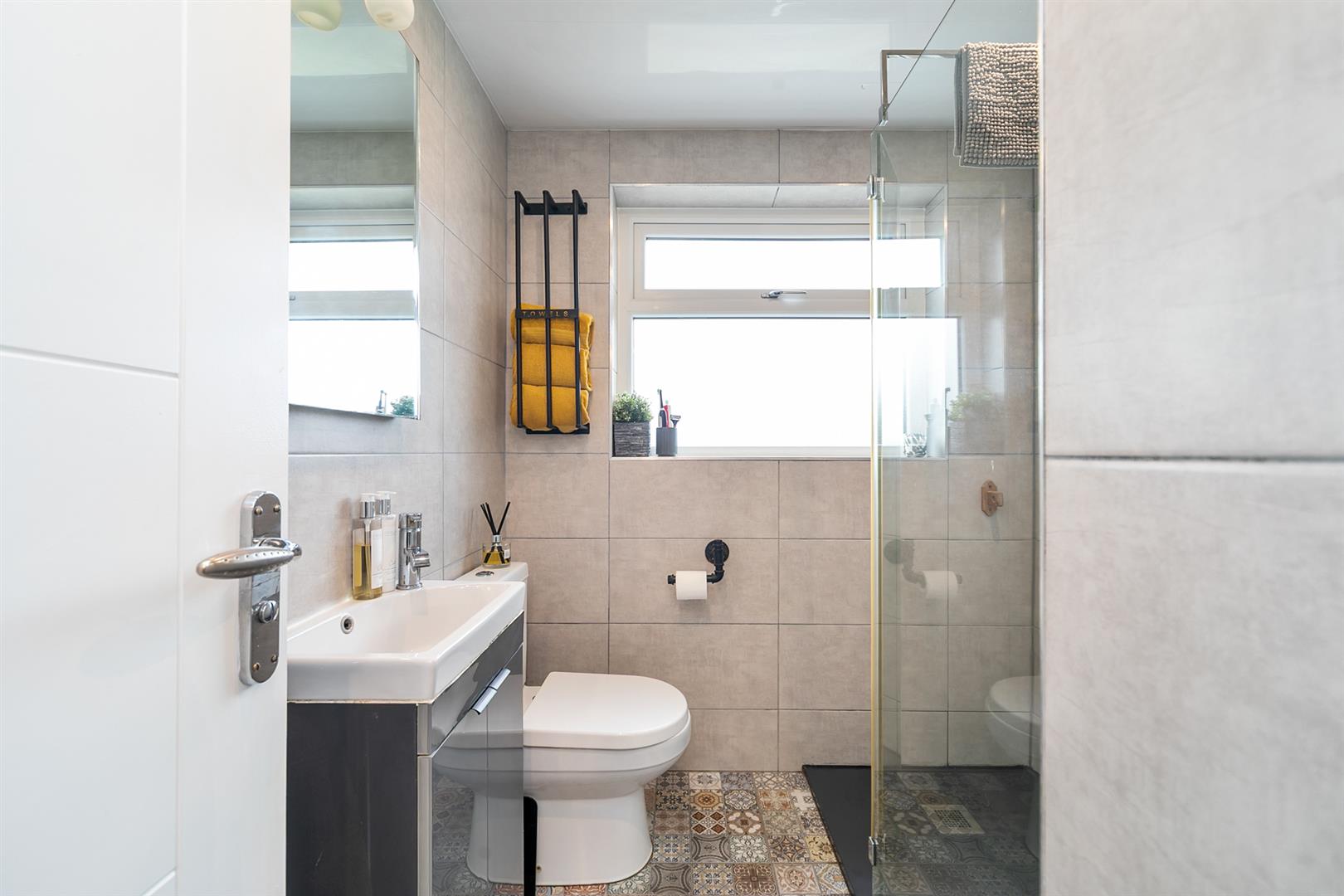 Comprising large walk in shower cubicle with chrome shower unit above, drench head shower and shower attachment, pedestal wash hand basin with mixer taps, low flush wc. Heated chrome towel rail.