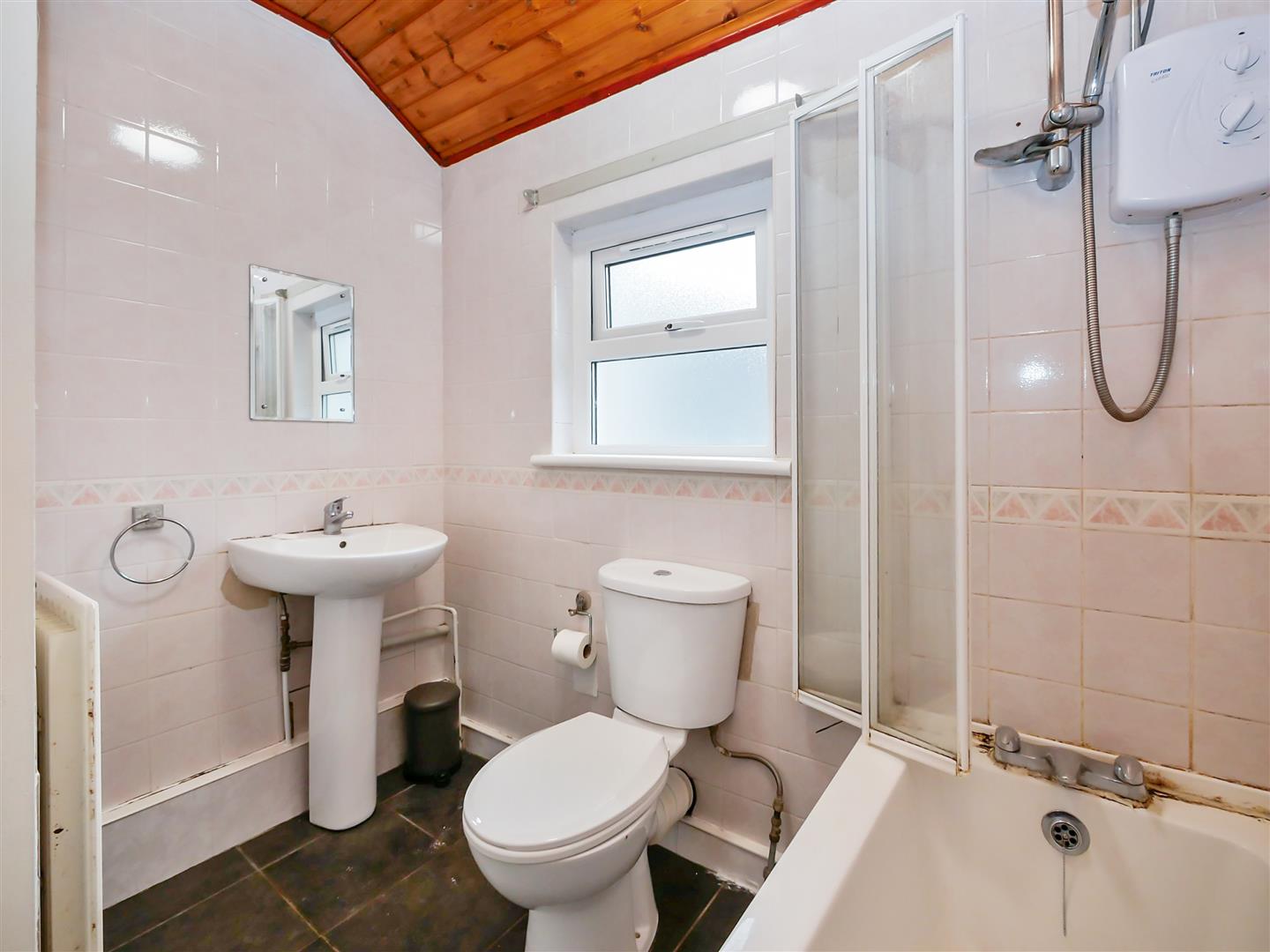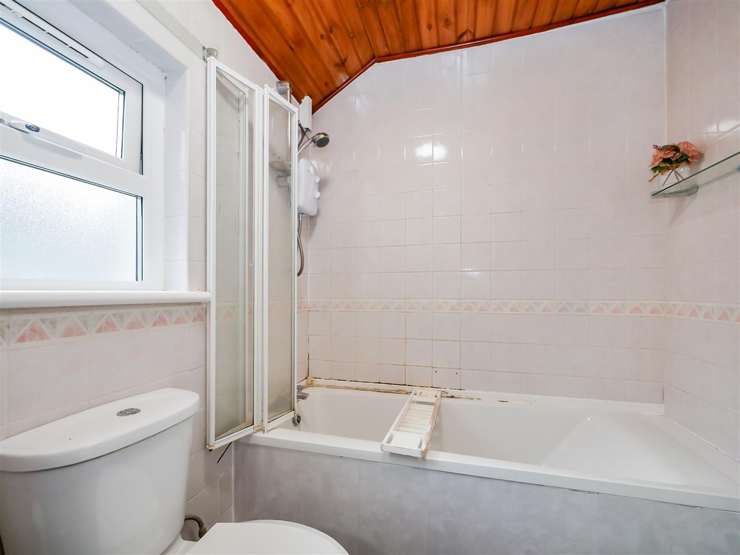 White bathroom suite comprising of panelled bath with overhanging electric shower, pedestal wash basin and low flush w.c. Access to built in storage. Tiled walls and tiled flooring.