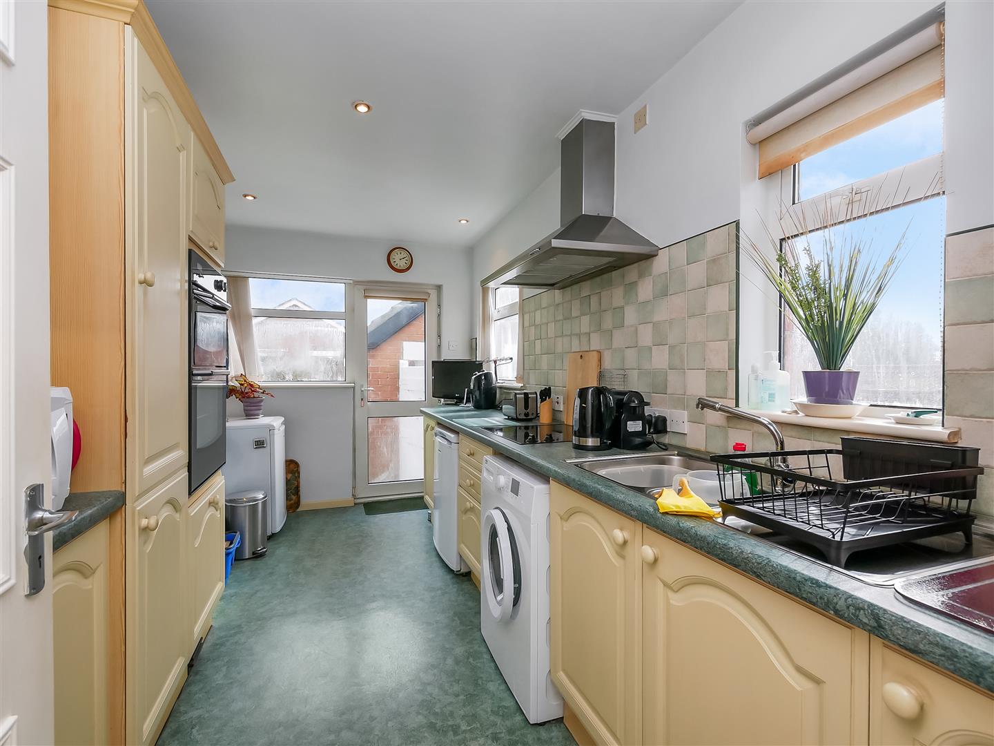 Extended kitchen with a selection of upper and lower level units complete with formica worktops, stainless steel sink with drainer, electric hob and stainless steel overhead extractor fan. Plumbed for washing machine. Part tiled walls and vinyl flooring. Glazed upvc door opens onto enclosed rear garden.