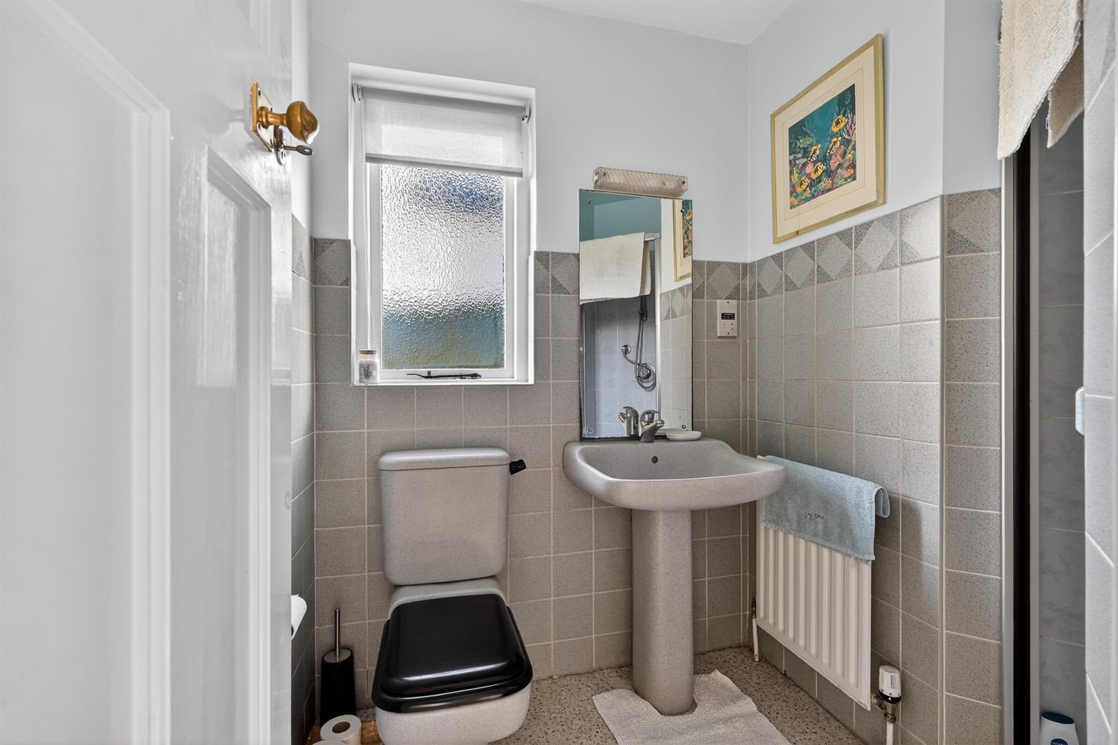 Low flush W.C, pedestal wash hand basin, enclosed shower, part tiled walls.