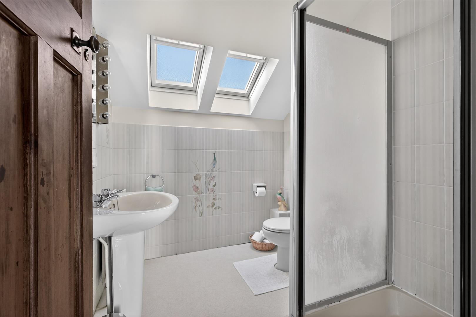 Low flush W.C, pedestal wash hand basin, enclosed shower.