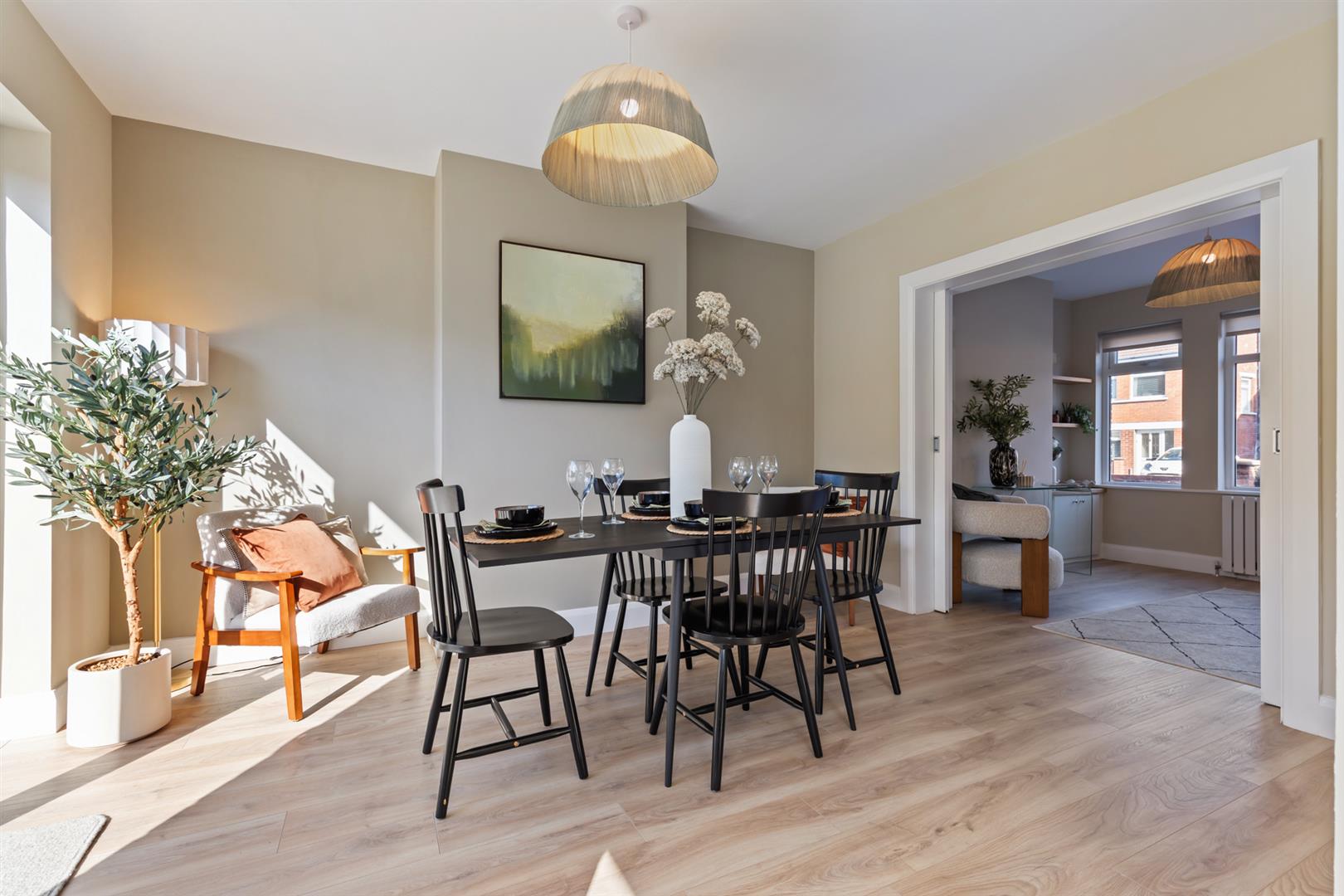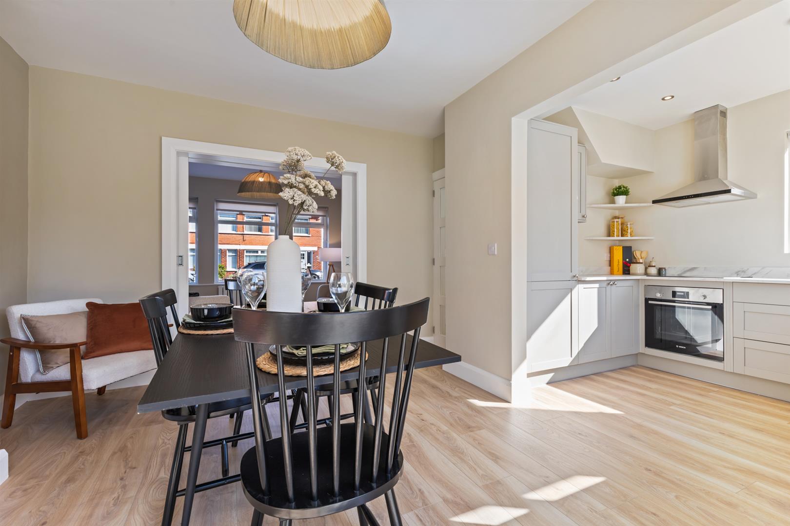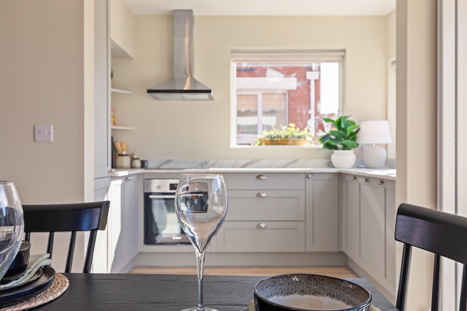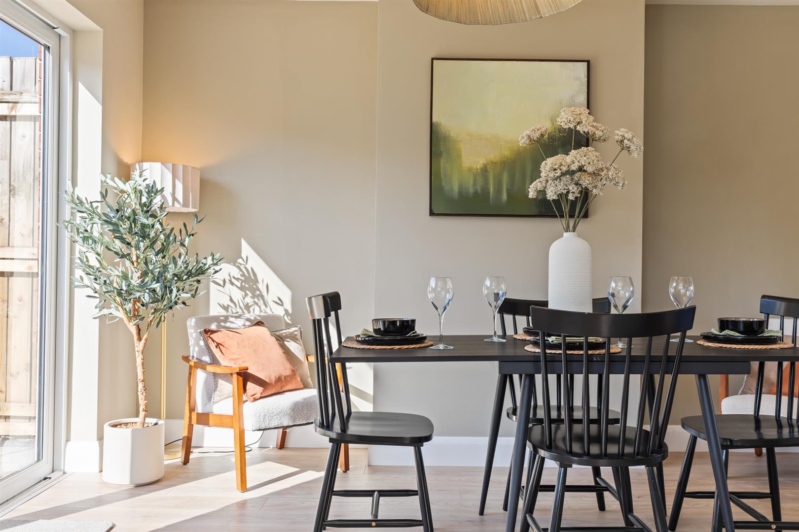 Dining area with laminate flooring open to modern fitted kitchen and lounge area. Glazed 'Rehau' sliding patio door opens onto enclosed rear garden.