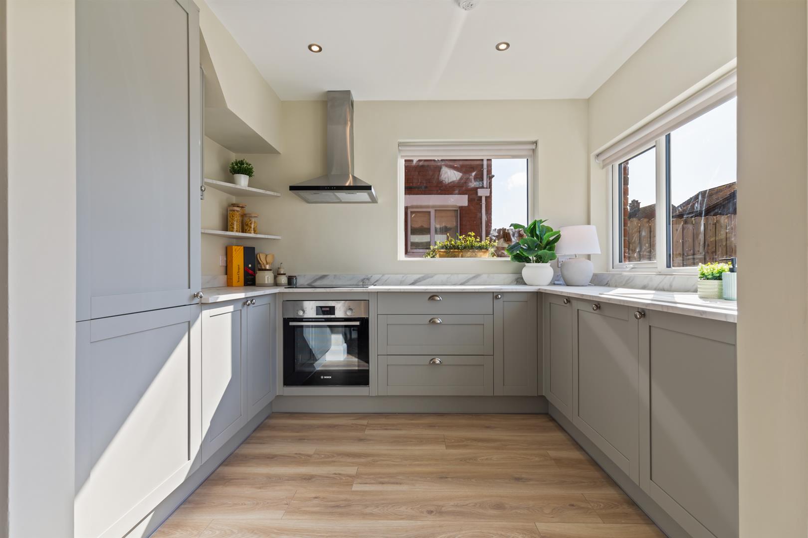 Newly installed kitchen with a selection of lower level shaker style units complete with marble effect counter tops, composite sink unit with stainless steel mixer taps and integrated Bosch appliances (fridge freezer, dishwasher and electric oven and hobs). Laminate flooring and recessed spotlights.