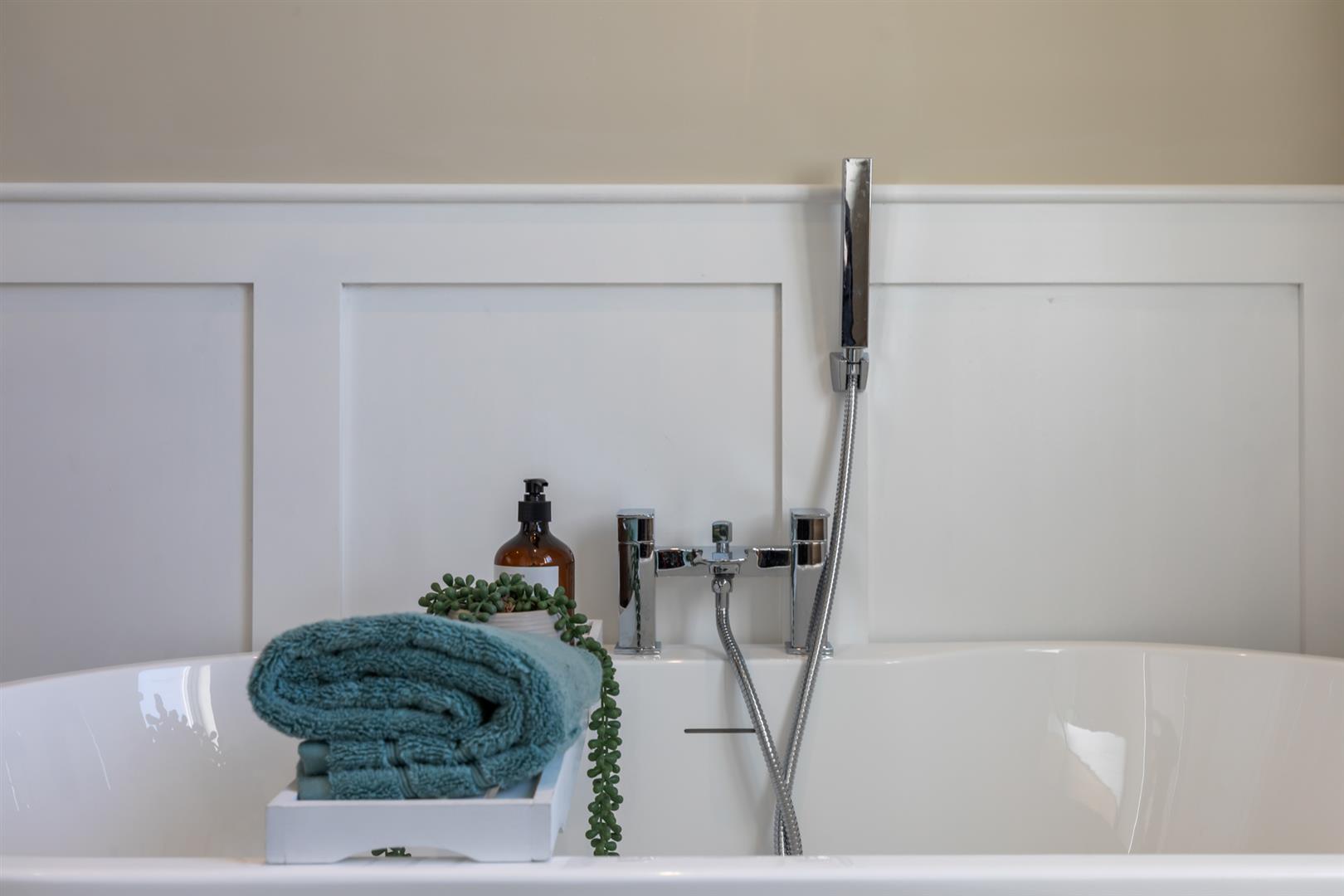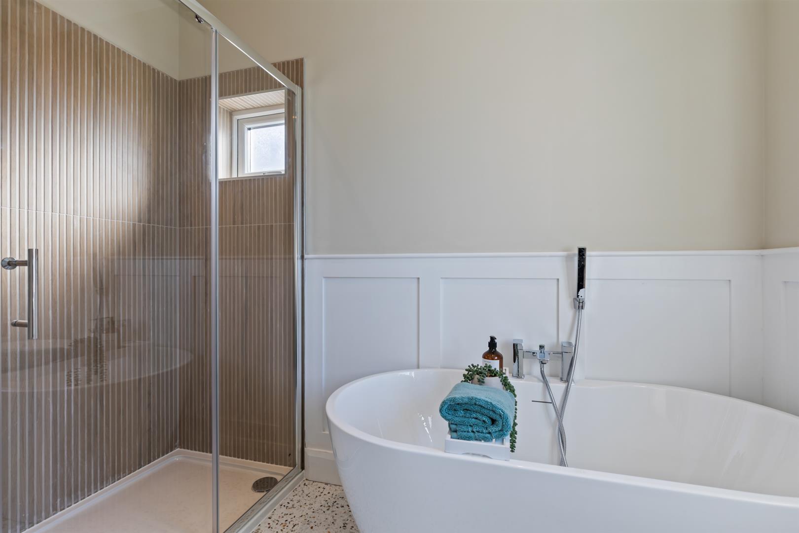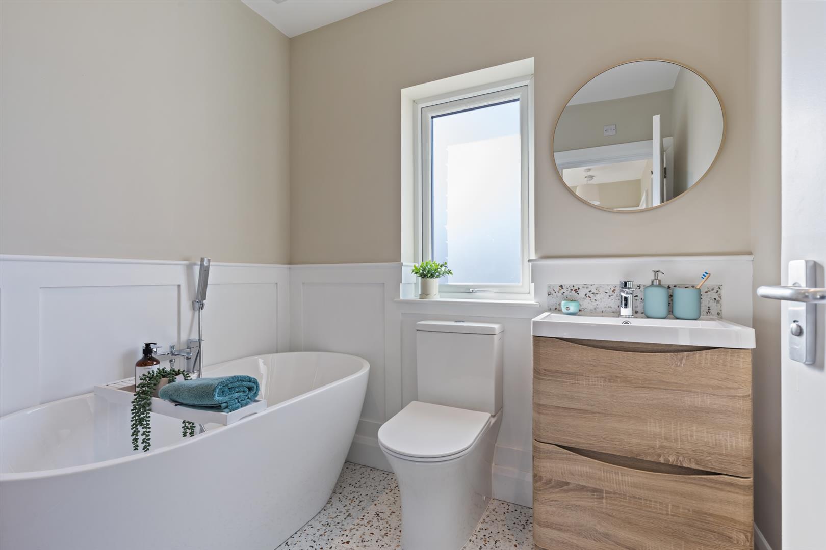 (measurements at widest points). Luxury white bathroom suite comprising of free standing oval bath with stainless steel mixer taps, large shower cubicle with stainless steel fittings and tiled walls, wash hand basin with stainless steel mixer taps and vanity, low flush w.c and heated chrome towel rail. Terrazzo effect tiled flooring and wall panelling.