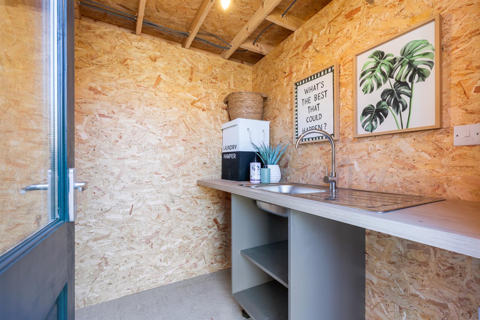 Custom built timber shed split into two separate sections complete with power and lighting. Separate utility area complete with wooden effect countertop, stainless steel sink with drainer and mixer taps, Plumbed for washing machine.