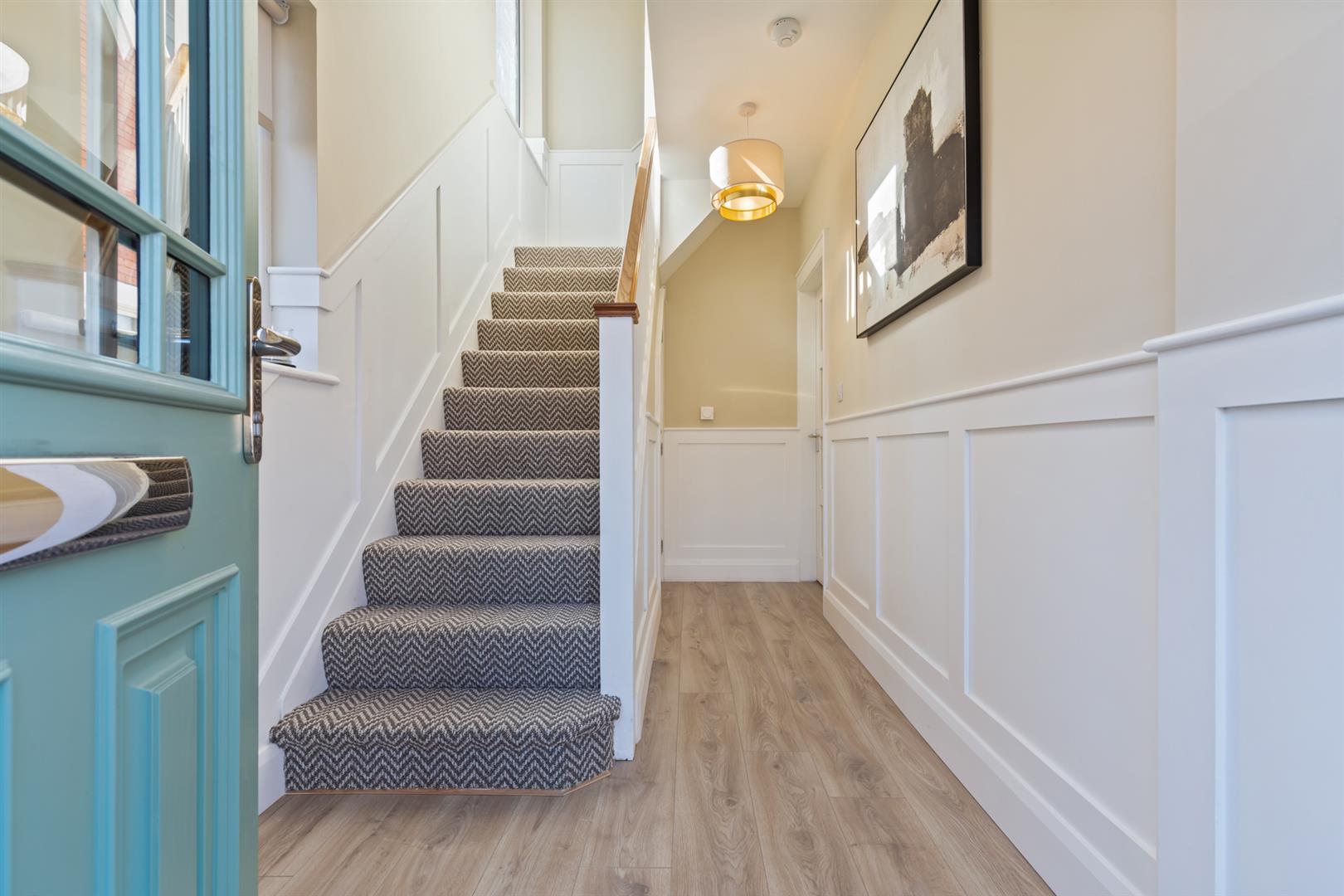 Glazed composite 'Palladio' front door opens onto bright and spacious entrance hall with laminate flooring, wall panelling and access to under stair storage housing gas combi boiler.