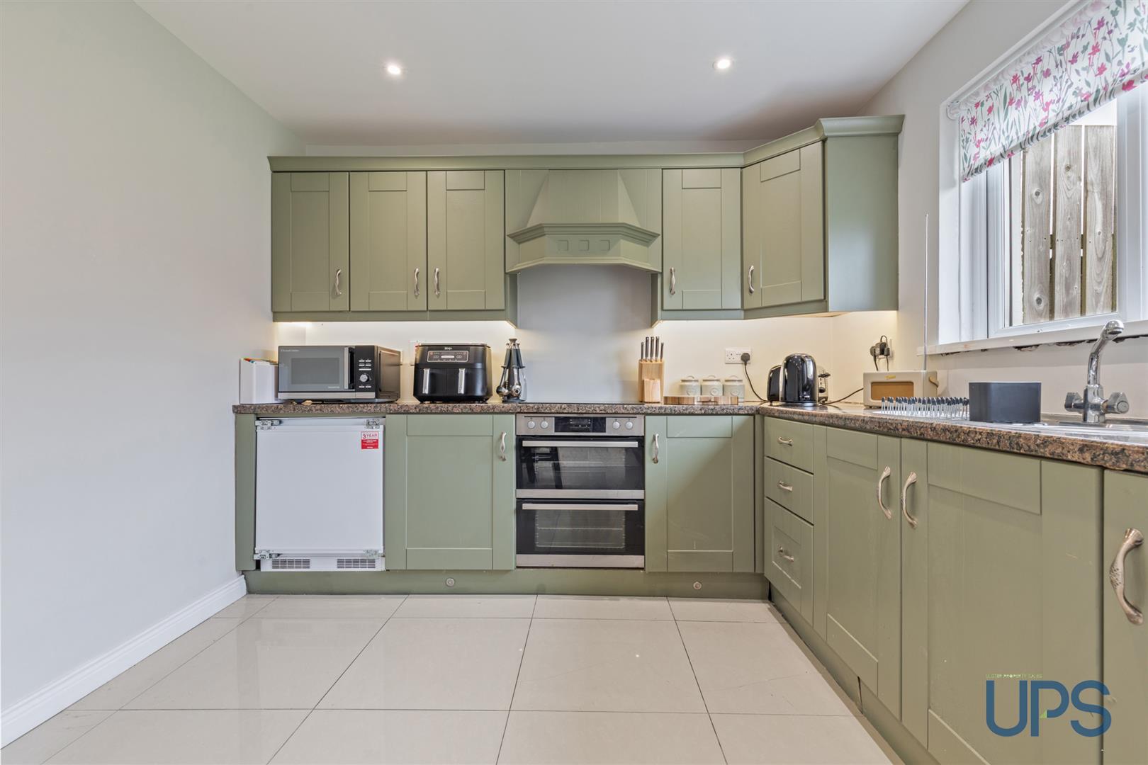 Range of high- and low-level units, single-drainer stainless steel sink unit, built-in hob and under-oven, extractor canopy, open plan to sizeable dining/entertaining area, spotlights, and UPVC double-glazed back door.