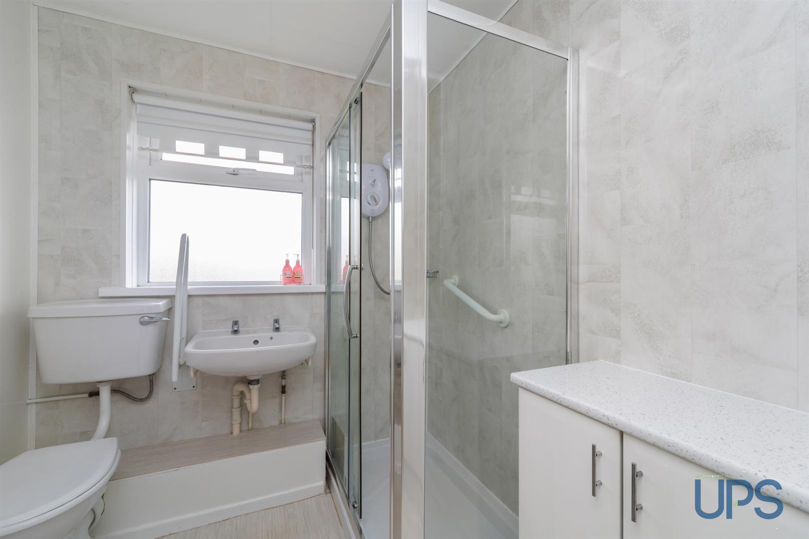 Shower cubicle, electric shower unit, low-flush W.C, wash hand basin, chrome effect sanitary ware.