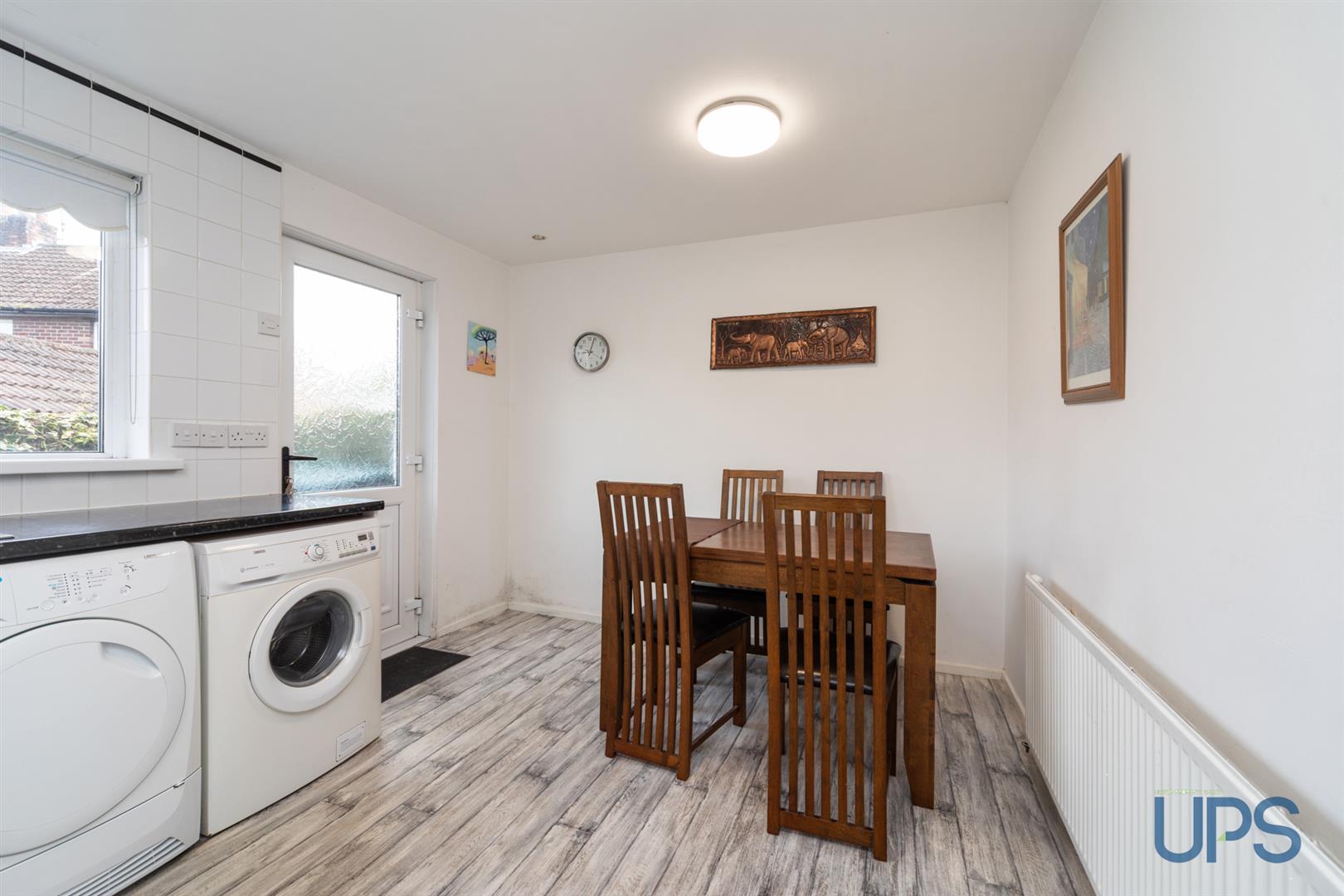 Range of high and low level units, single drainer stainless steel 1 1/2 bowl sink unit, extractor fan, partially tiled walls, open plan to dining space, Upvc double glazed back door.