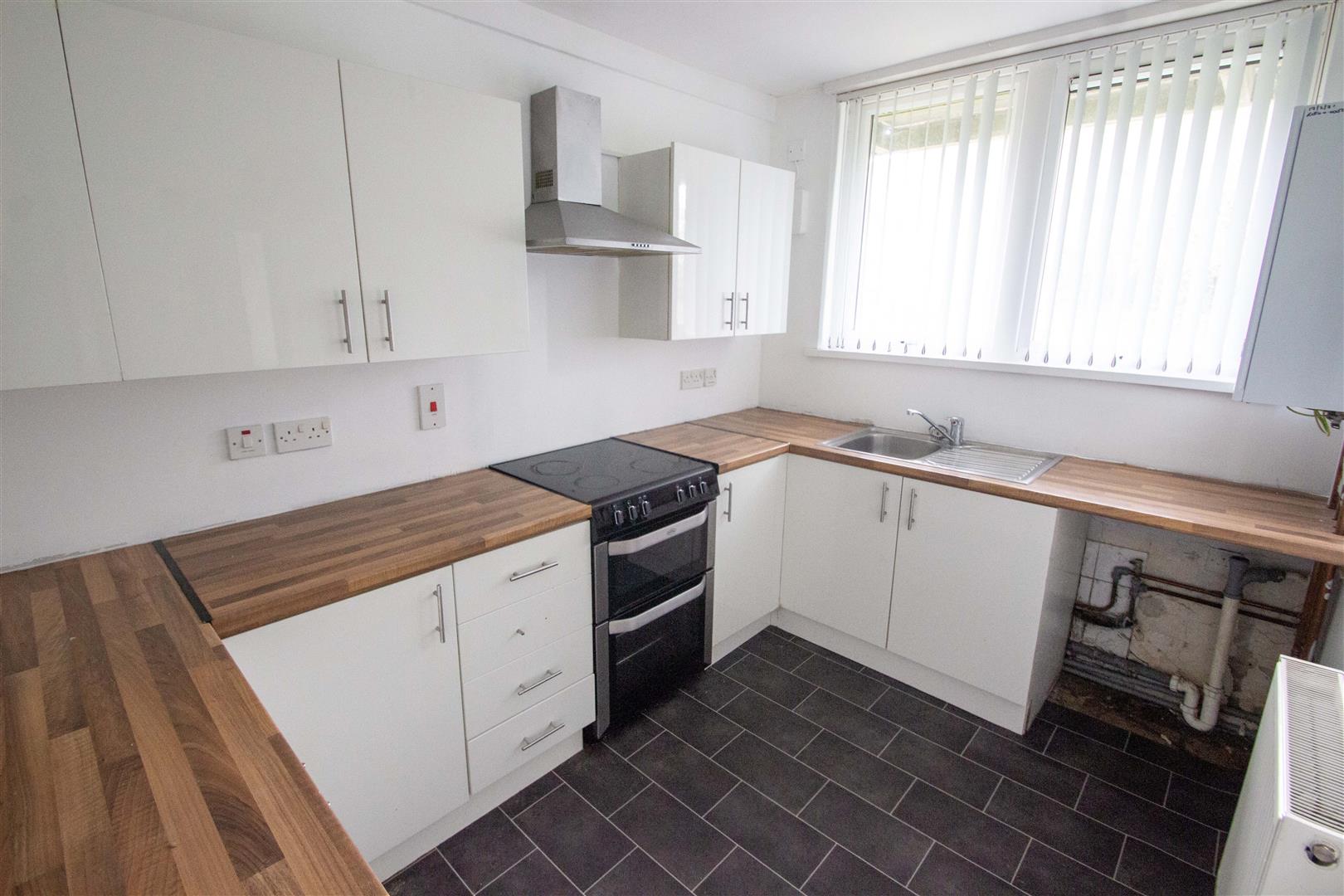 Range of high and low level units, single drainer stainless steel sink unit, plumbed for washing machine, gas boiler.