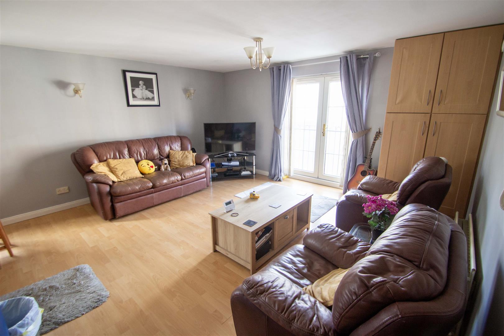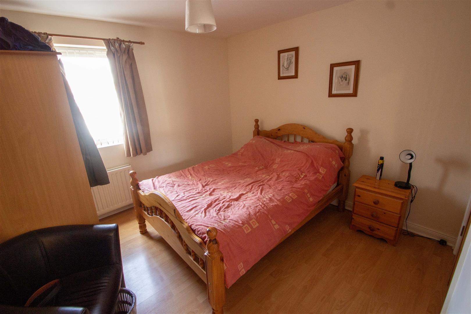 Laminated wood effect floor, built-in robe.