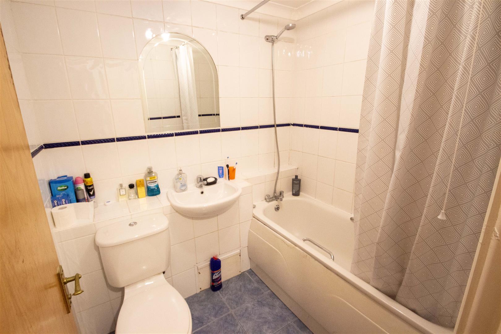 Bath, telephone hand shower, low-flush W.C., wash hand basin, tiled walls, tiled floor, extractor fan.