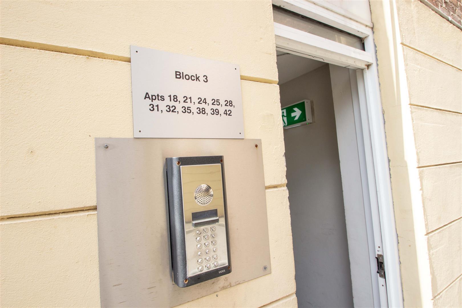 Communal entrance with intercom access and stairwell to upper floors.