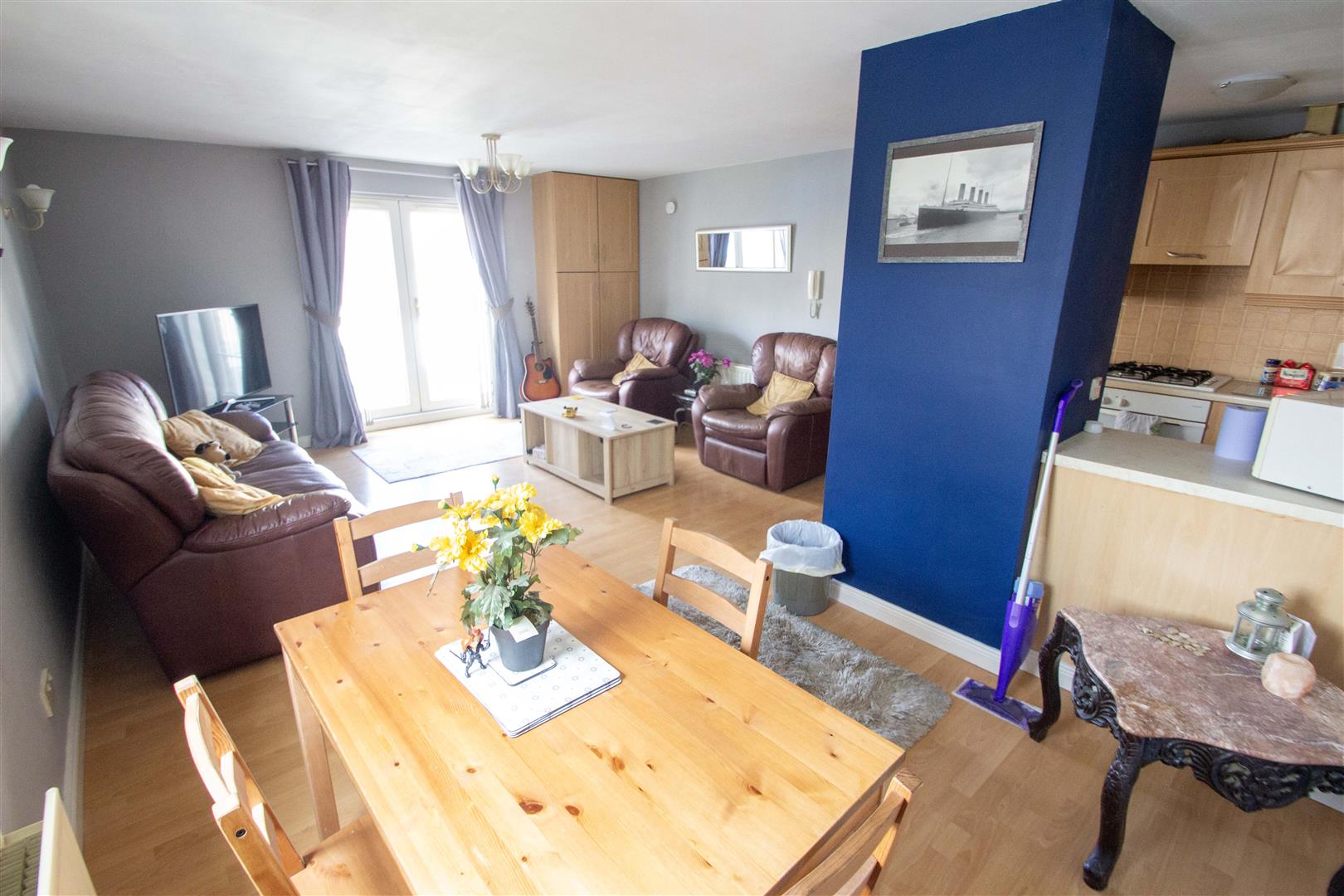 The property benefits from a bright and airy open-plan living room, seamlessly connected to a fitted kitchen and dining area. There are two well-proportioned double bedrooms and a bathroom with a white suite.