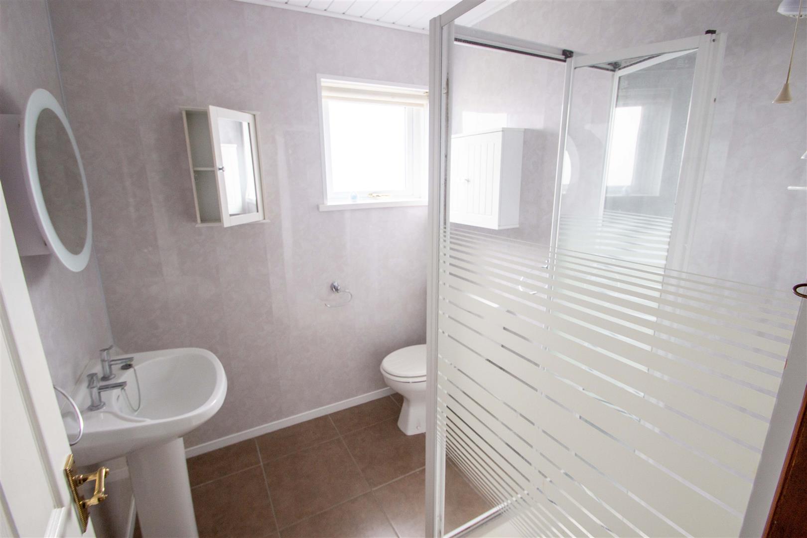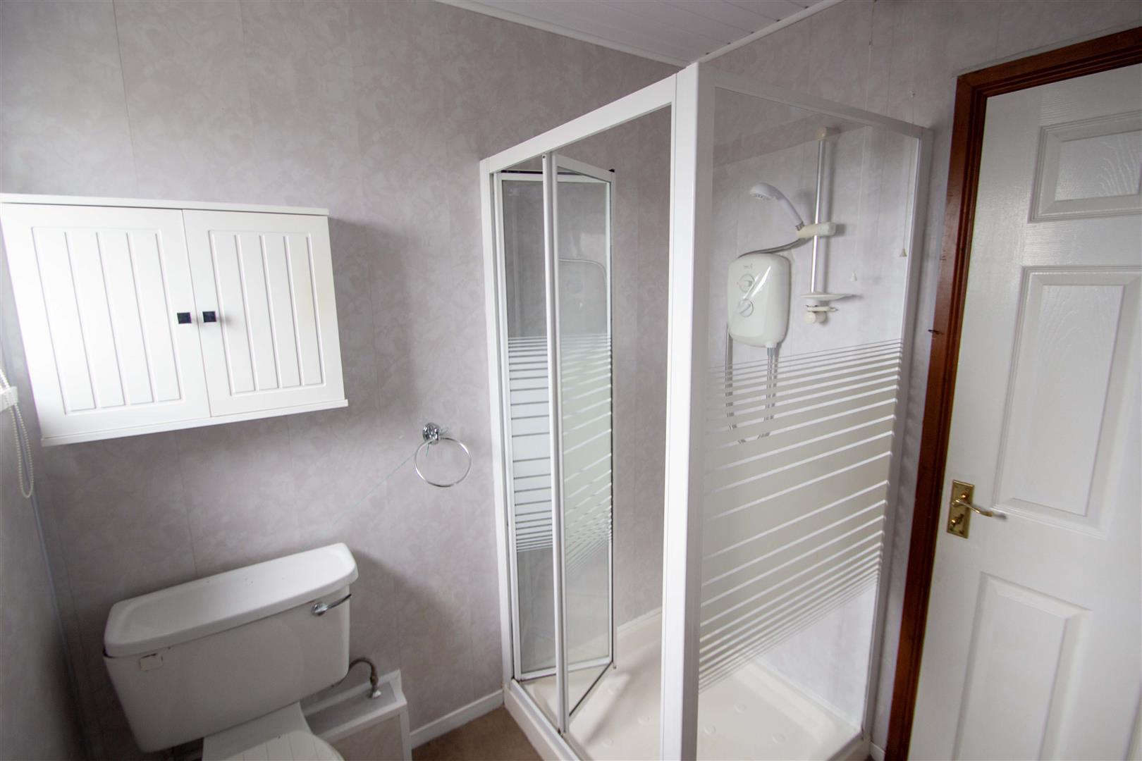 Shower cubicle, electric shower unit, low-flush W.C., pedestal wash hand basin.