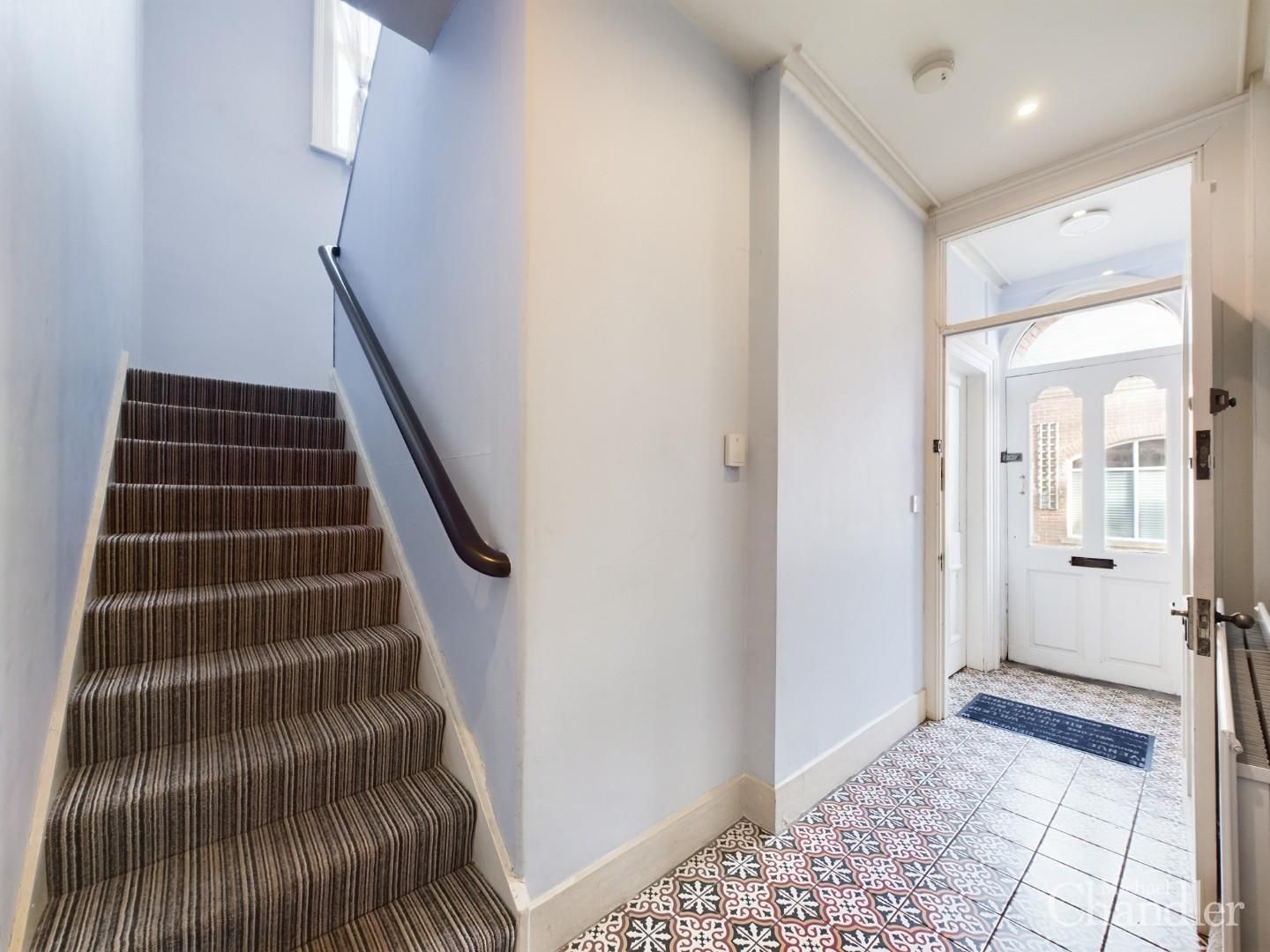 Welcoming entrance hall with stunning feature floor tiles and storage cupboard