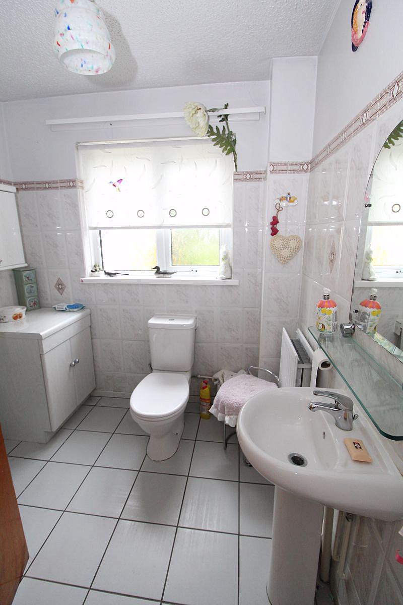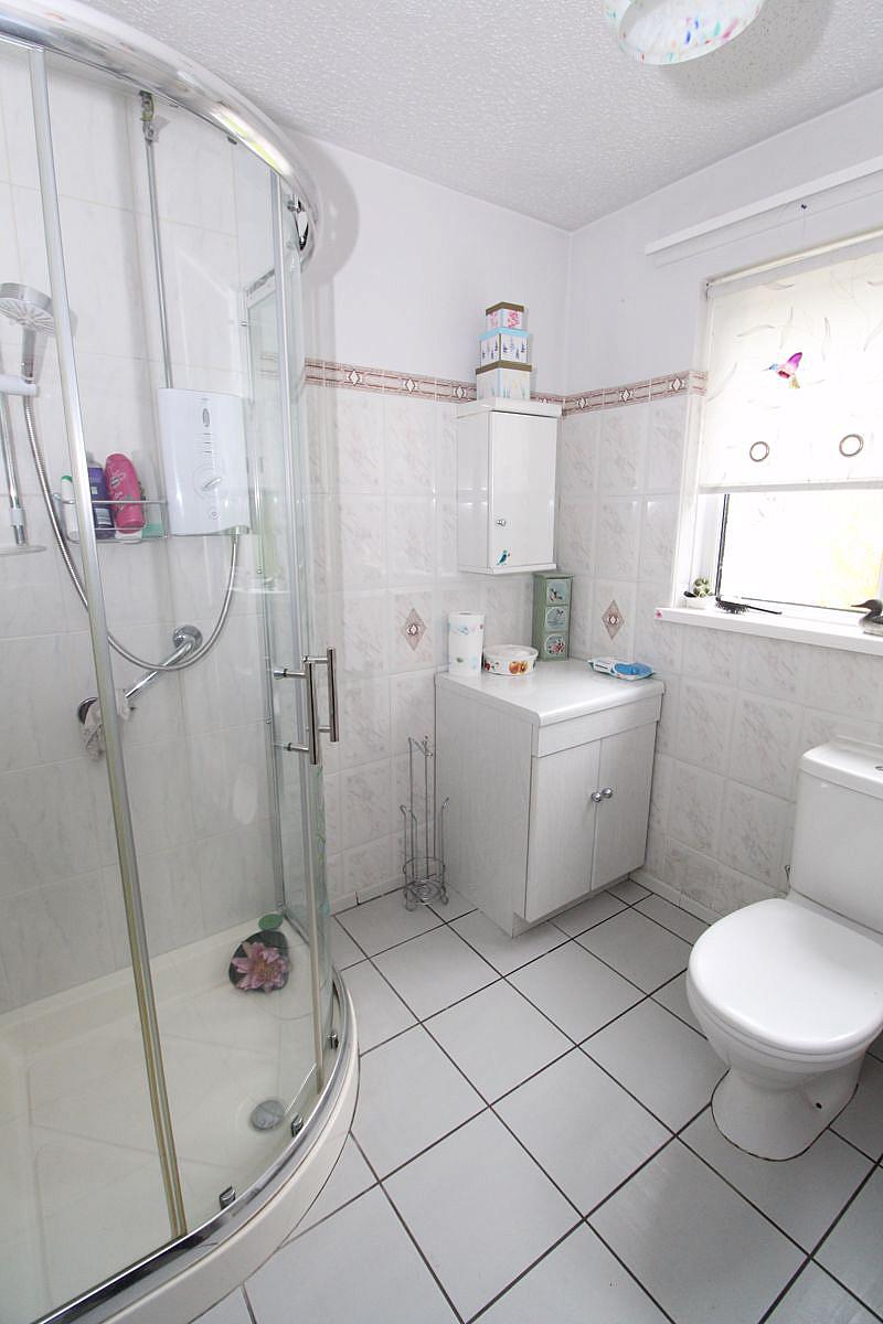 White suite comprising low flush WC, pedestal wash hand basin and quadrant shower cubicle with Mira electric shower, part tiled walls, ceramic tiled floor, double panel radiator.