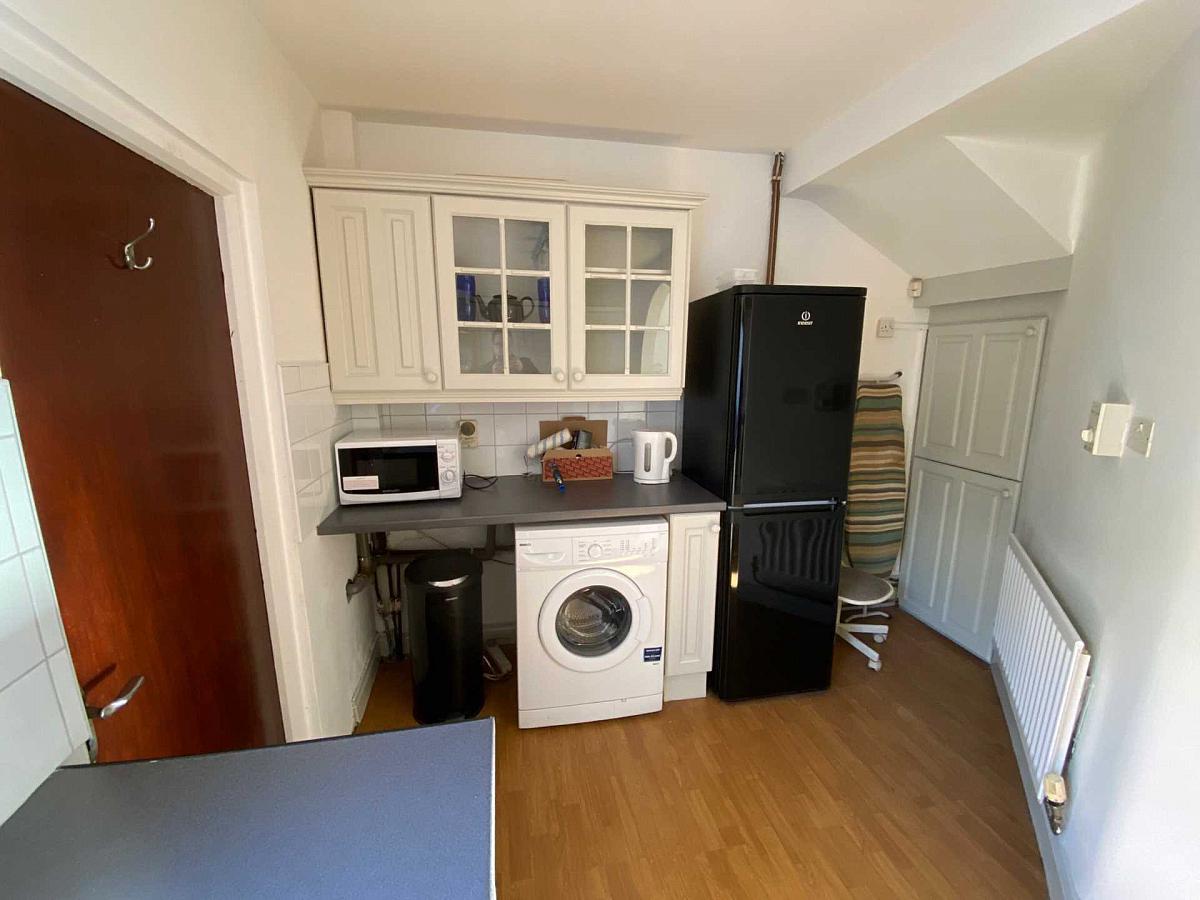 Fitted kitchen with range of high and low level units. Appliances include built-in oven and gas hob, washing machine and fridge freezer. Space for dishwasher or tumble dryer.