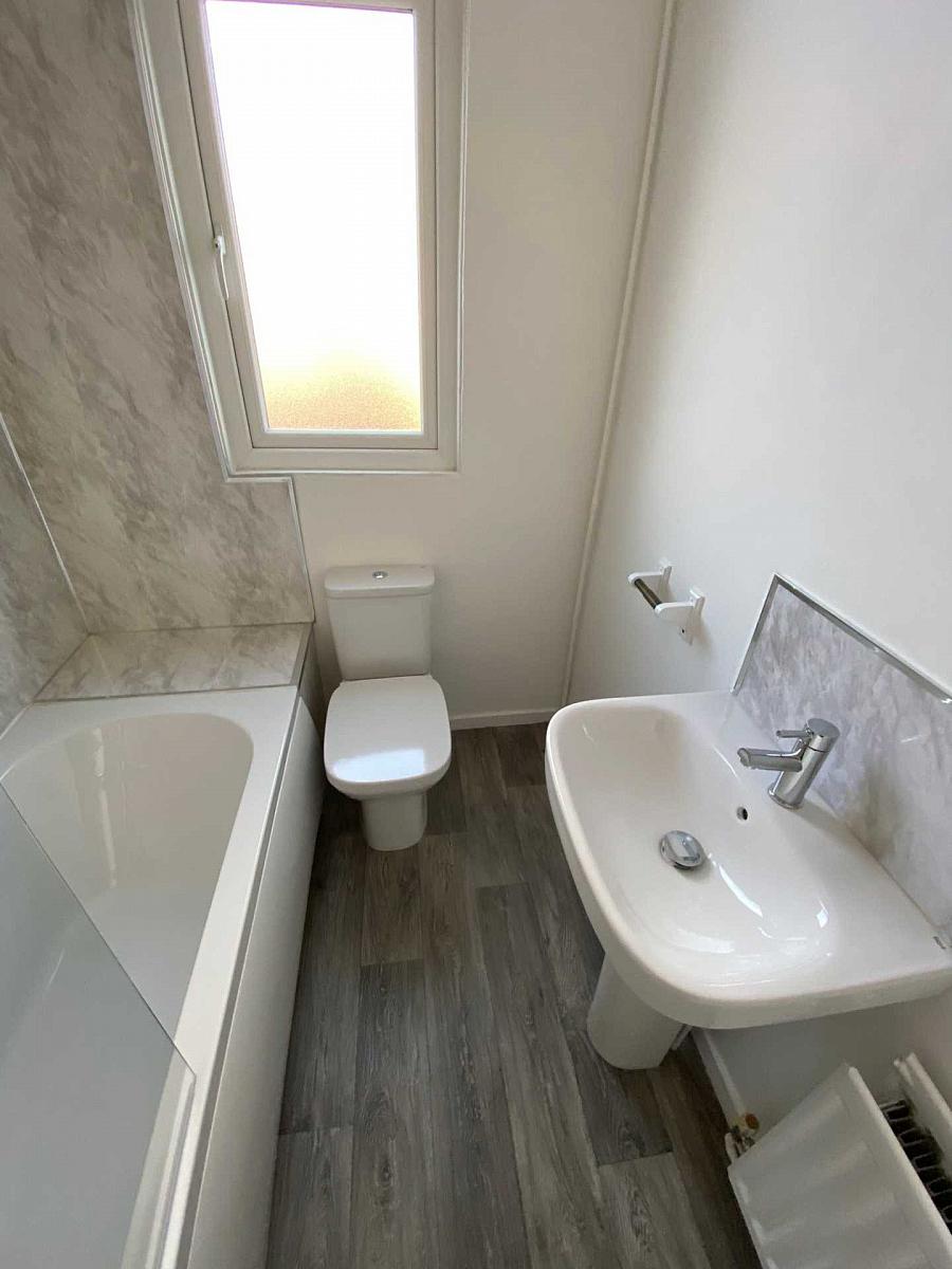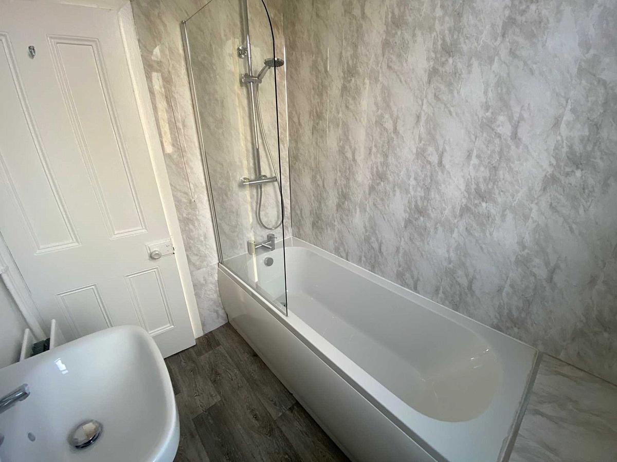 Contemporary bathroom with white 3 piece suite and thermostatic shower over bath. Wood effect vinyl flooring and part marble effect PVC panelled walls.
