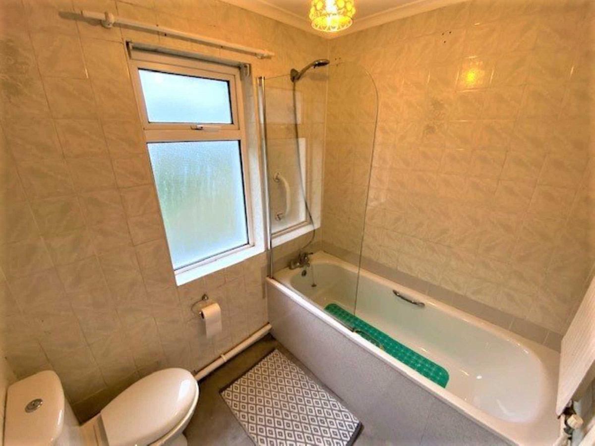 Bathroom with bath suite and shower over bath, fully tiled walls and tile effect vinyl flooring.