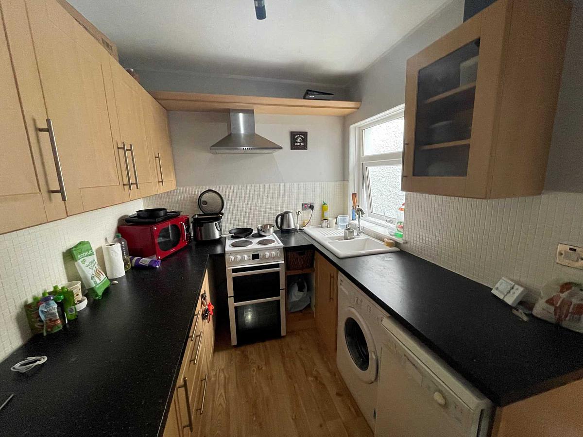 Kitchen with range of high and low level units in Beech finish. Corian black effect work surfaces, double sink, appliances included, part tiled walls, wooden flooring and breakfast bar.