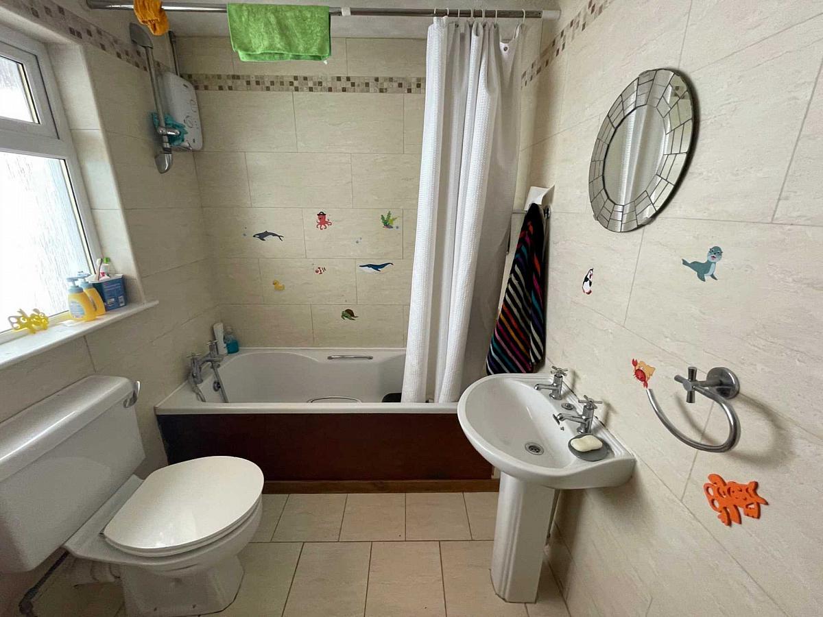 Bathroom suite to include bath with shower over, WC, WHB, fully fitted.