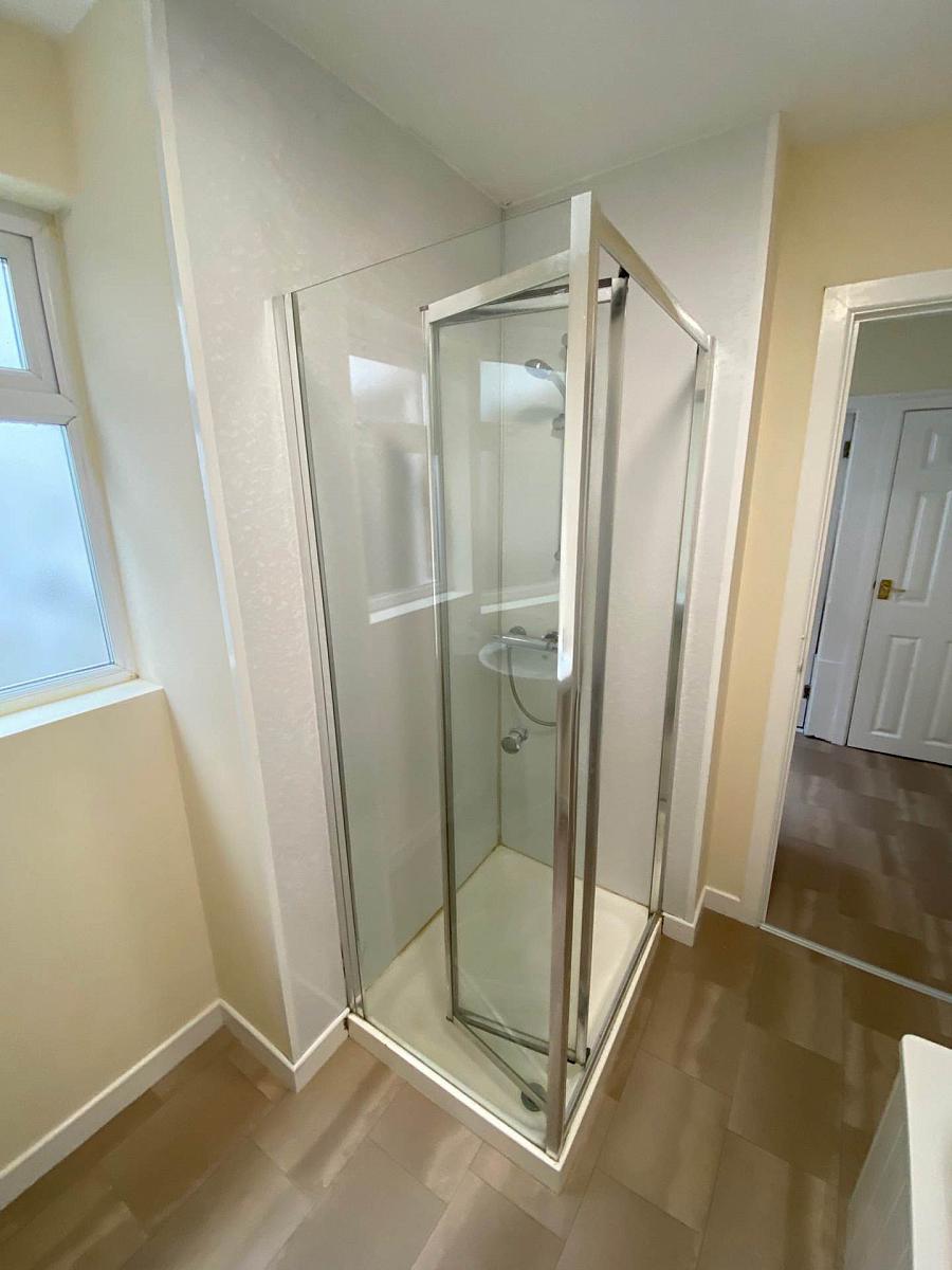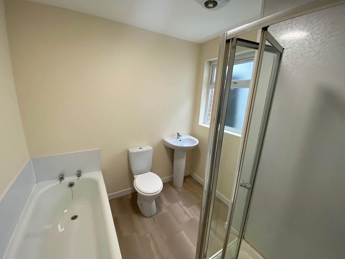 Bathroom - Modern white suite to include, bath, shower, low flush toilet and wash hand basin.