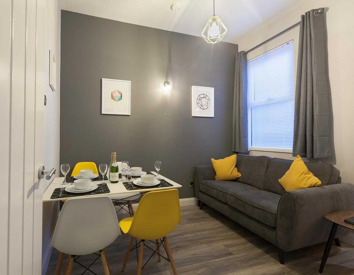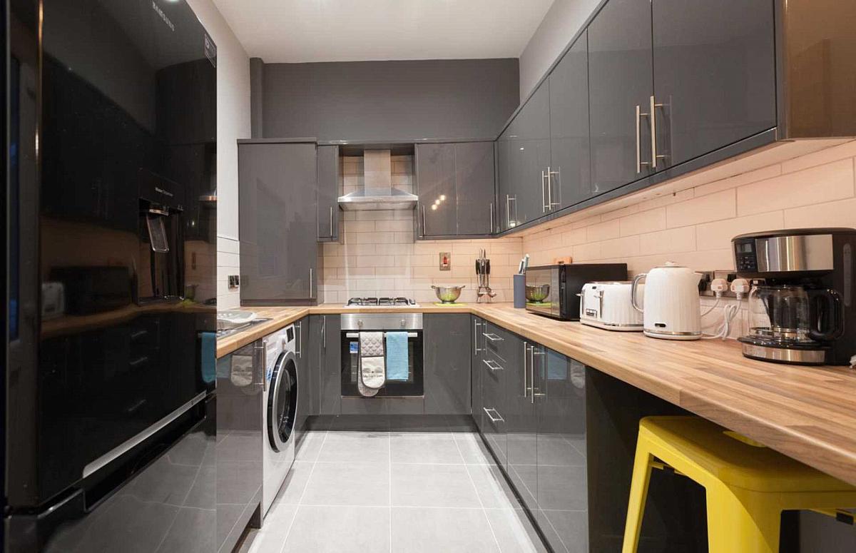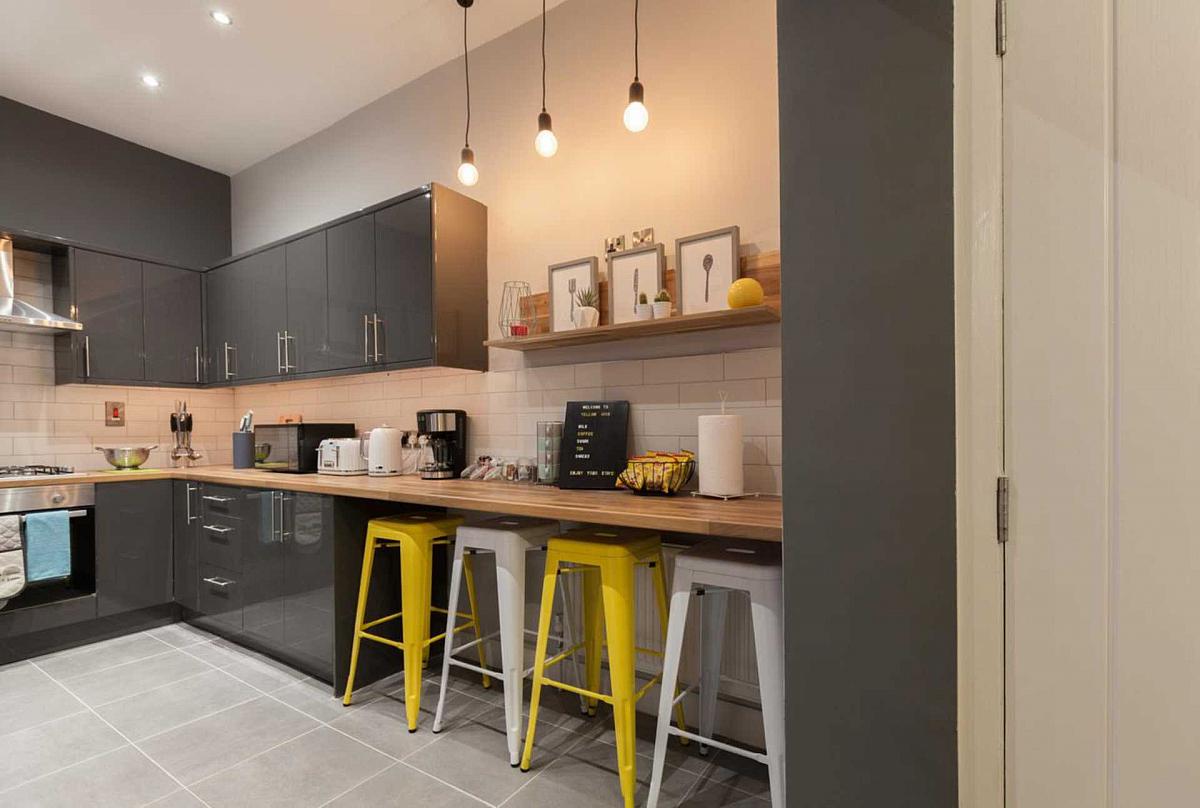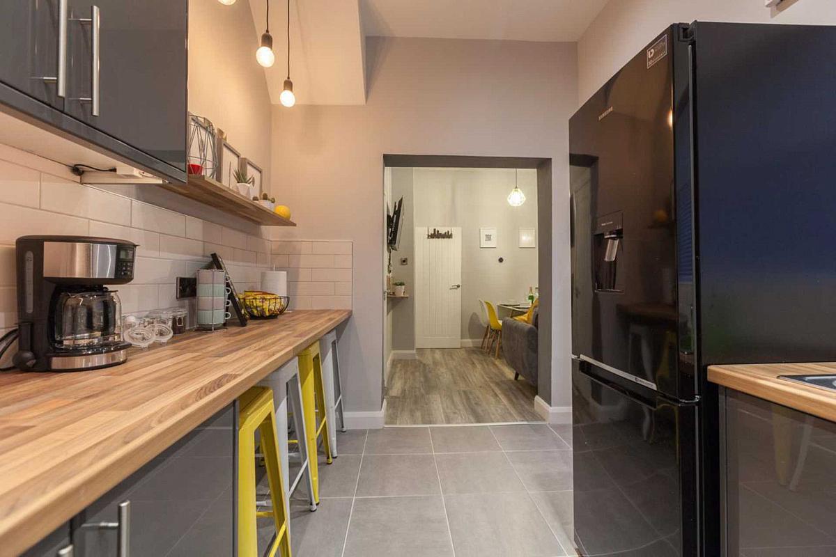 Equipped fitted kitchen with appliances, breakfast bar and dining area, wall mounted flat screen TV.