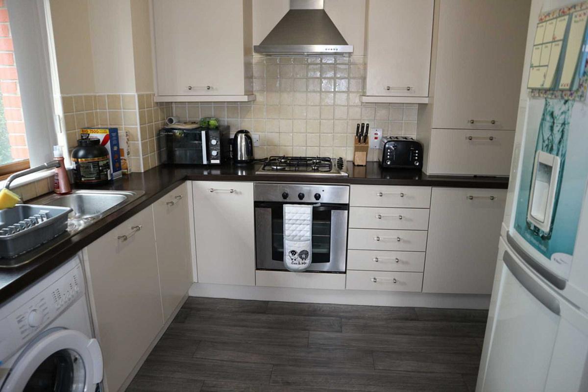 Modern Kitchen with built-in gas hob, electric oven & extractor fan. Part tiled walls and vinyl flooring.