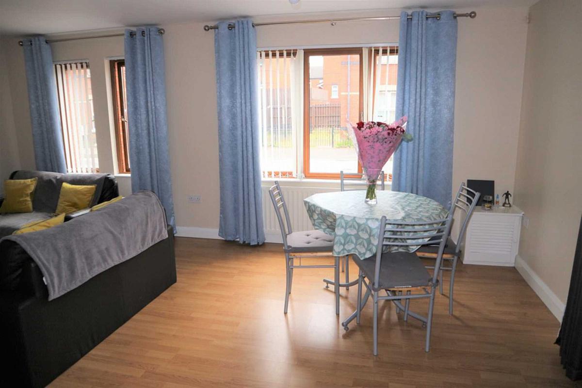 Large spacious lounge/dining area open plan to kitchen. Neutrally decorated & laminate flooring.