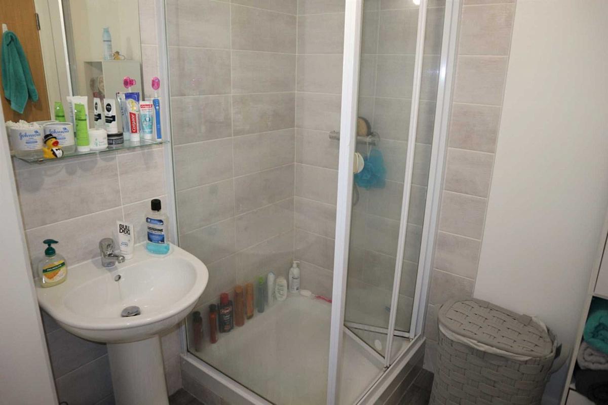 Bathroom with a shower cubicle with thermostatic shower. Part tiled walls. Wood effect vinyl flooring.