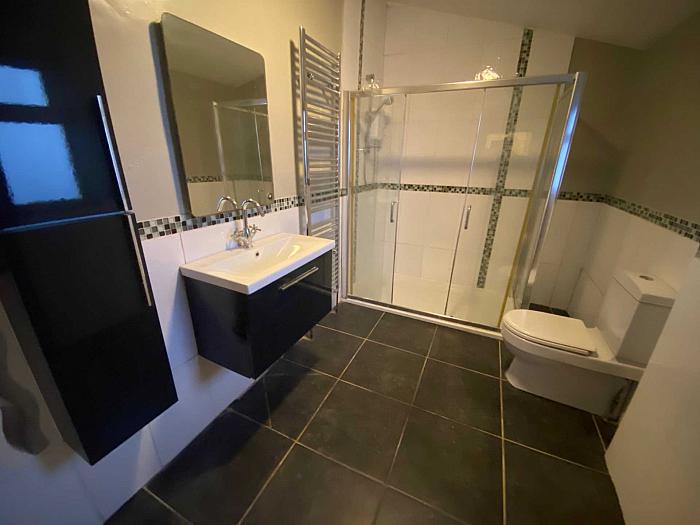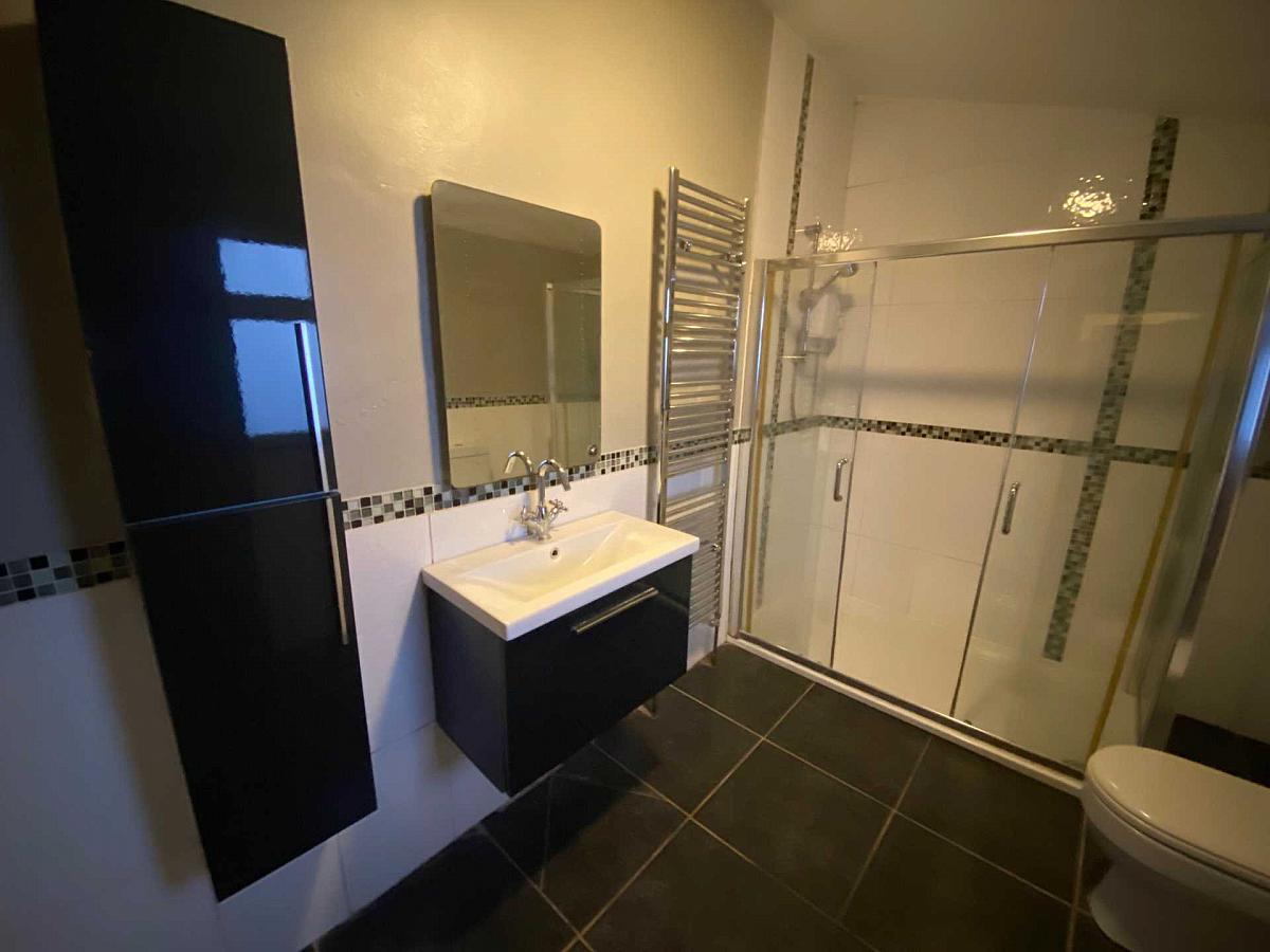 Modern, three piece white suite comprising of wall vanity unit with storage, double shower cubicle with sliding door, cupboard, mirror and radiator