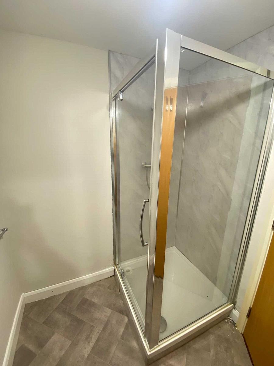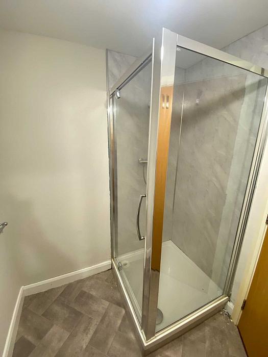 White suite comprising of shower cubicle with shower, low flush toilet and sink with mixer tap.