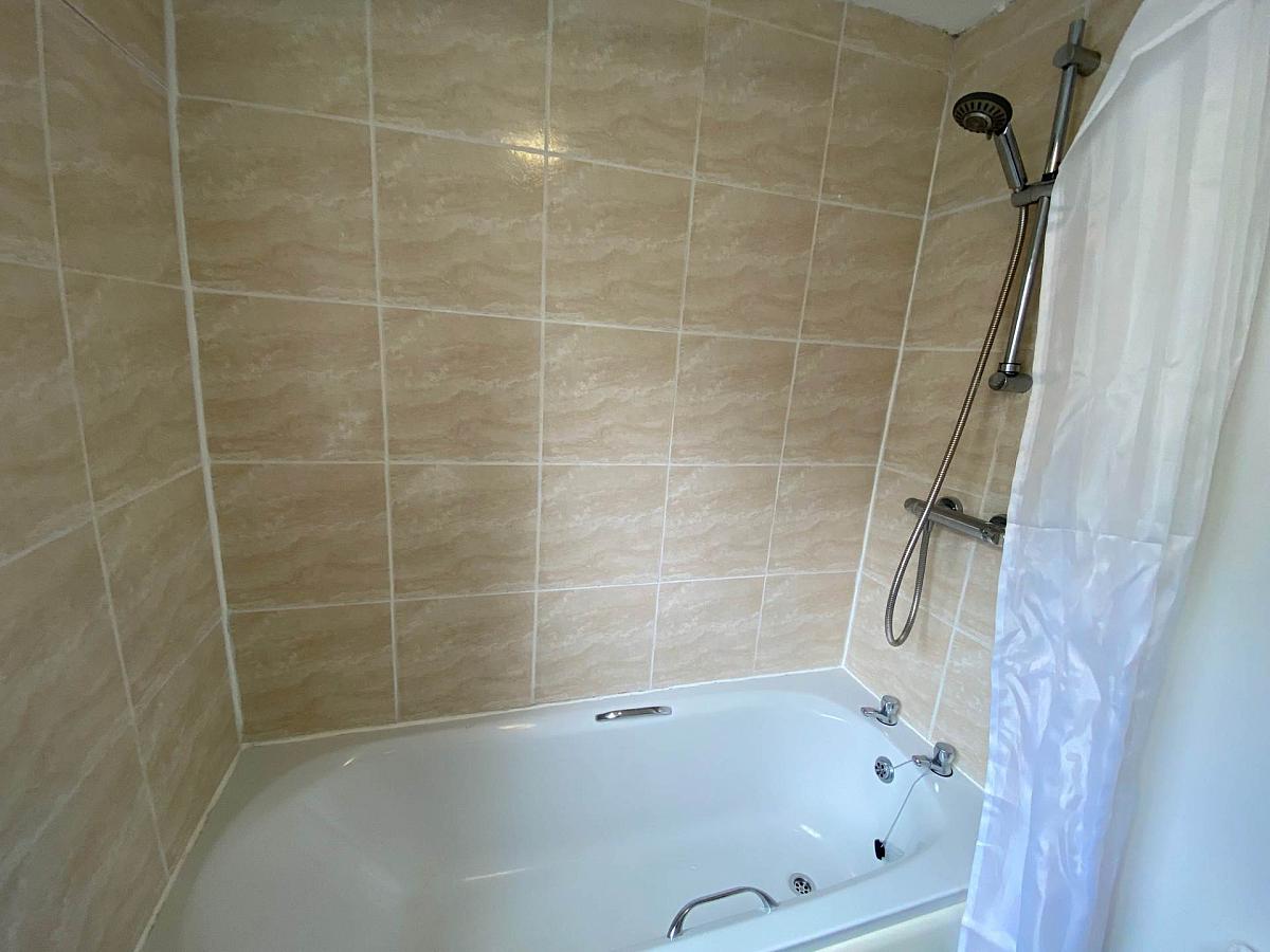 Grey fitted kitchen with excellent range of high and low level units. Built in hob, oven and extractor fan, space for washing machine and fridge/freezer. Part tiled walls. Tiled effect floor.