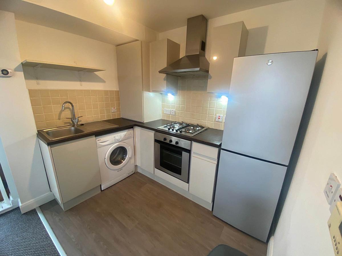 Modern fitted kitchen with range of high and low level units, part tiled walls and wood effect vinyl flooring. Appliances included.