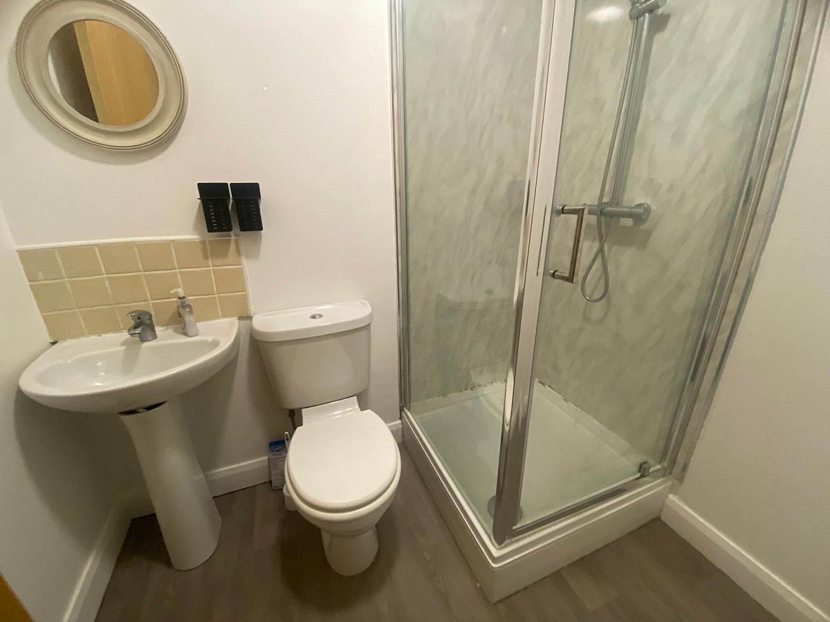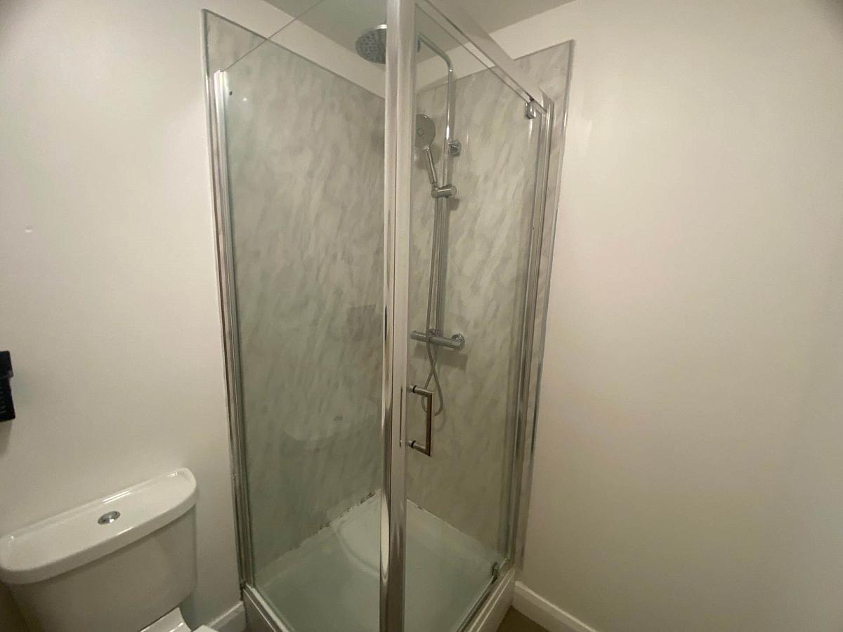 Bathroom with thermostatic shower-in-cubicle, neutrally decorated and tile effect vinyl flooring.