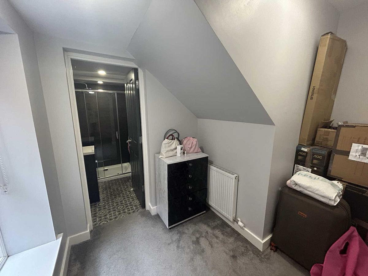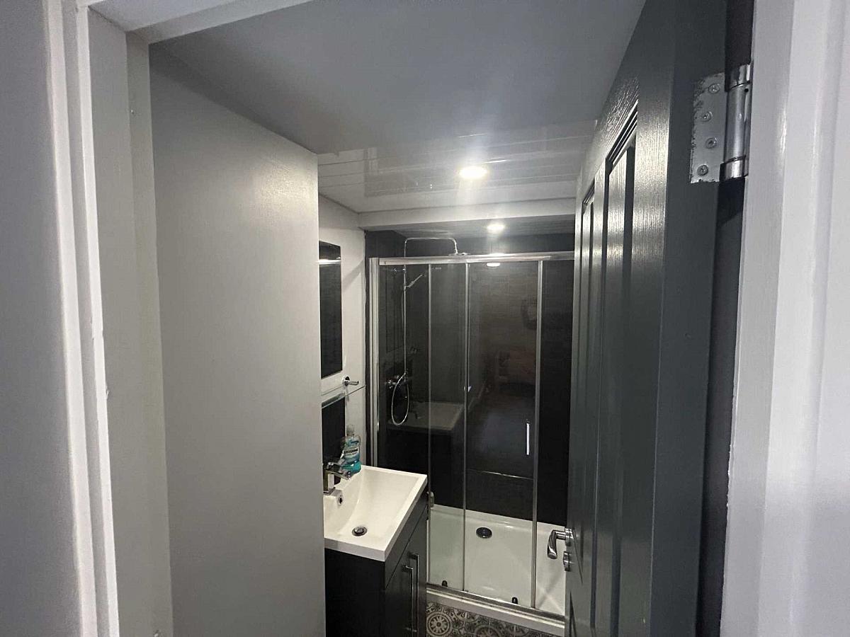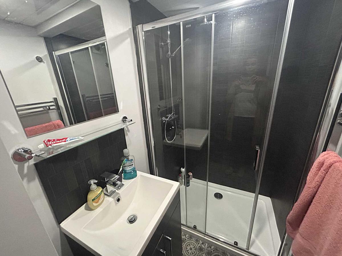 Shower room with thermostatic shower, sink with storage and heated towel rail