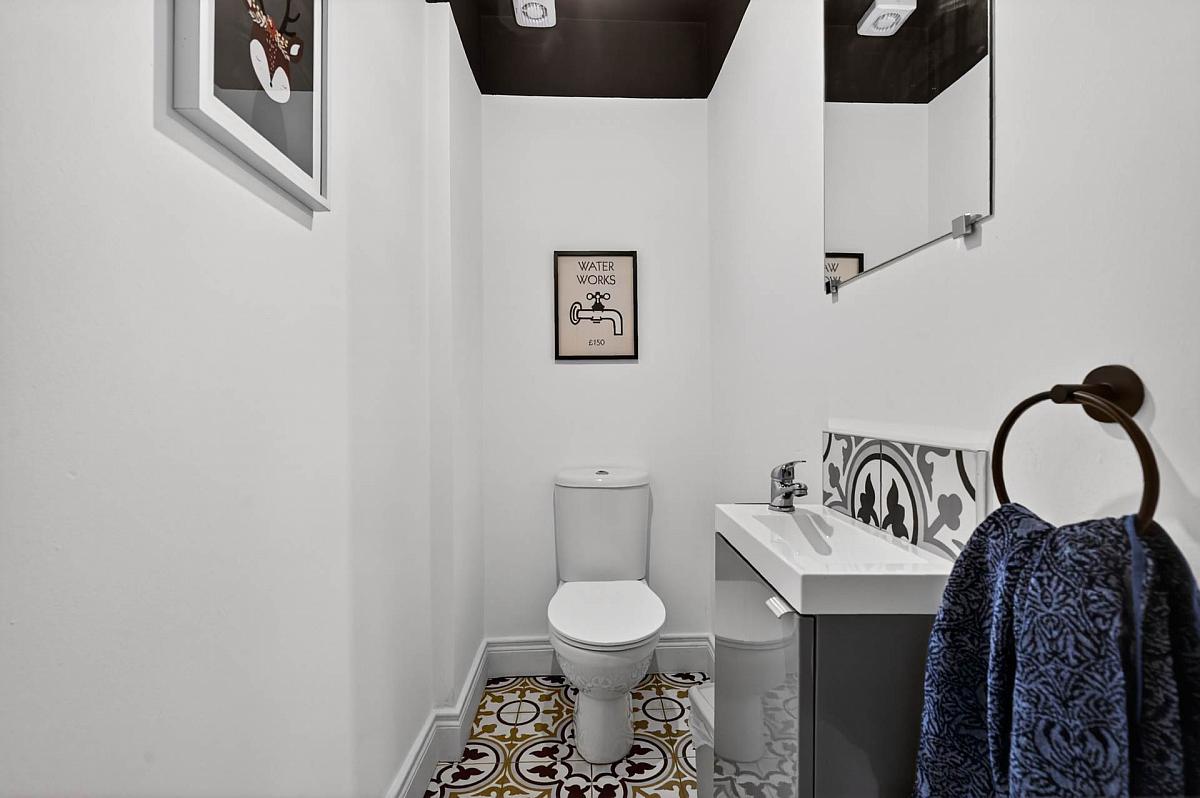 Low flush toilet. Vanity sink unit with mixer tap. Tiled floor.