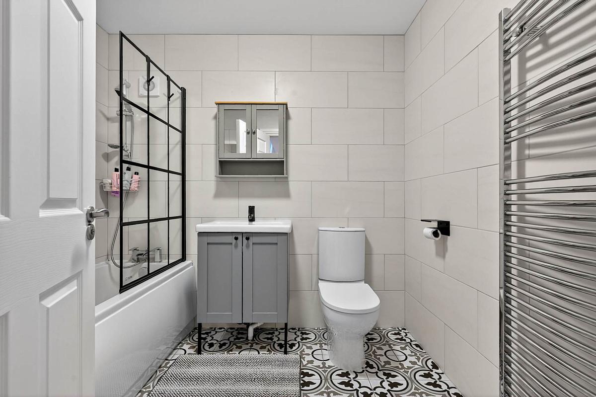 Luxury White Bathroom suite to include bath with shower over and shower screen. Vanity sink cupboard with mixer tap and matching cabinet. Low flush toilet. Towel radiator. Tiled walls and floor.