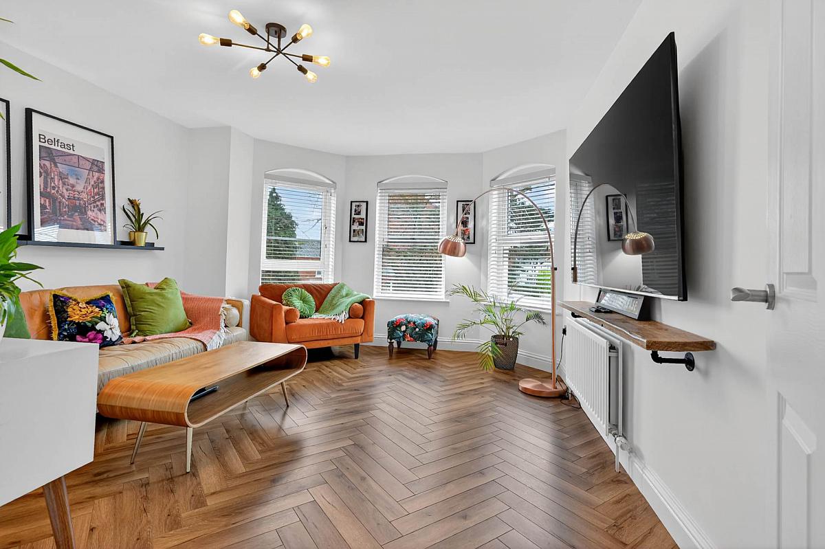 Spacious bedroom / lounge, bay window. Herringbone Oak wooden floor.